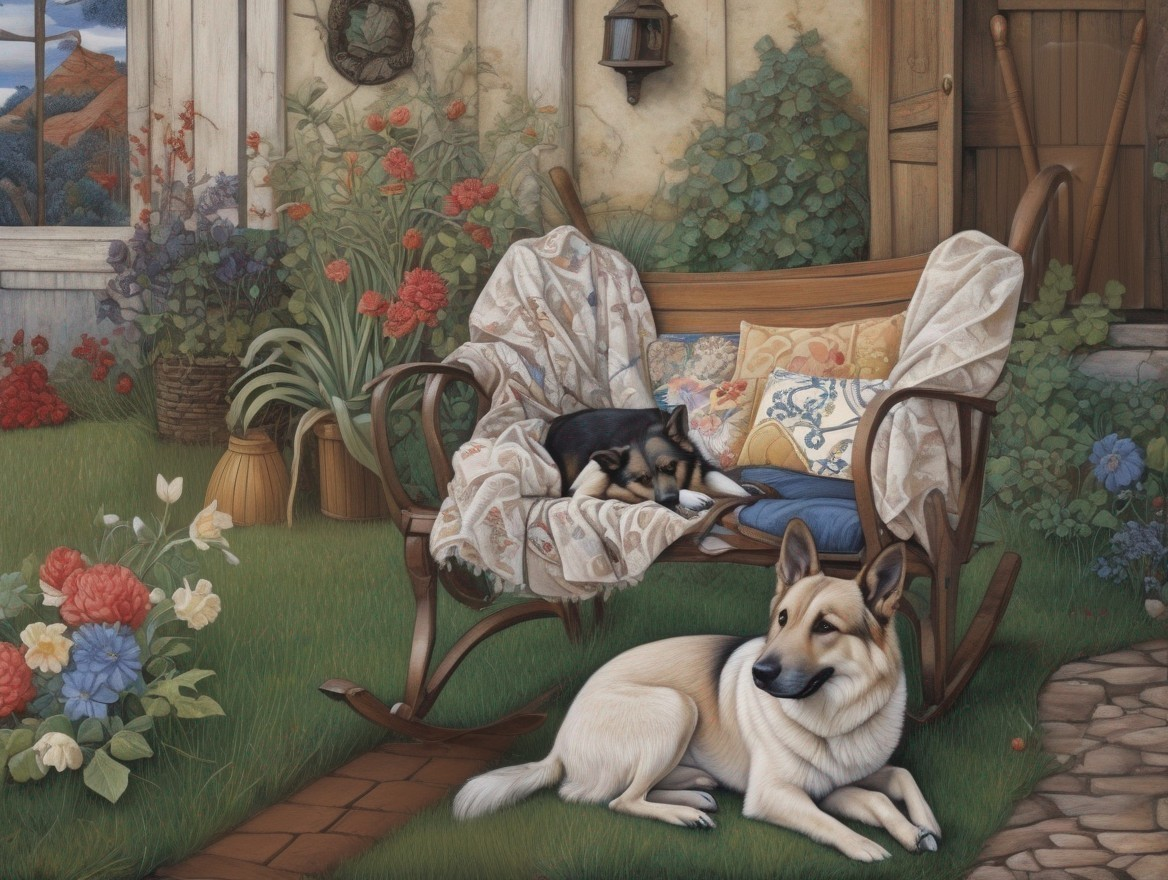 Garden scene with two dogs, one on alert for a family member, there is just enough room on the rocker bench for someone to come and rock and relax with the pups..