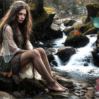 A young woman sits by a tranquil stream, surrounded by snow and colorful autumn leaves. Her long hair flows freely, and she wears a flowing, nature-inspired outfit, creating a serene, magical atmosphere.