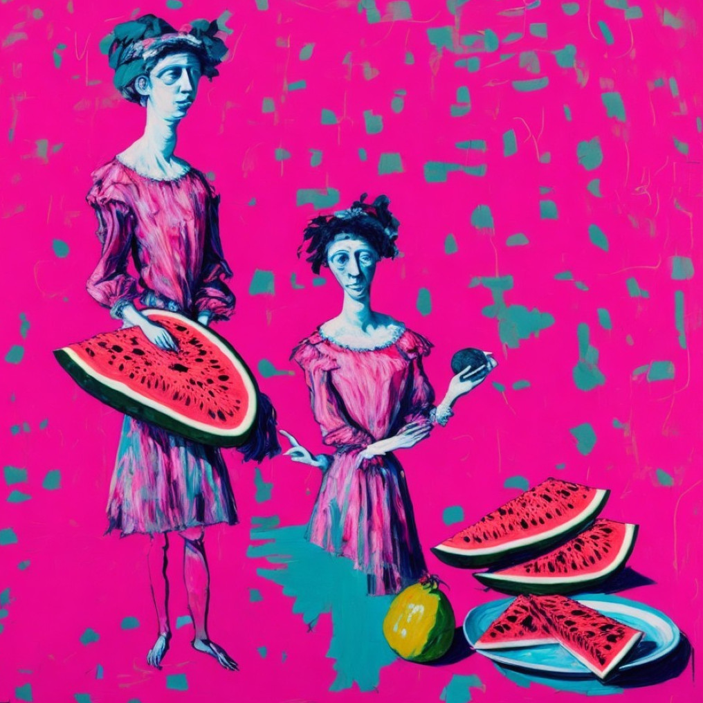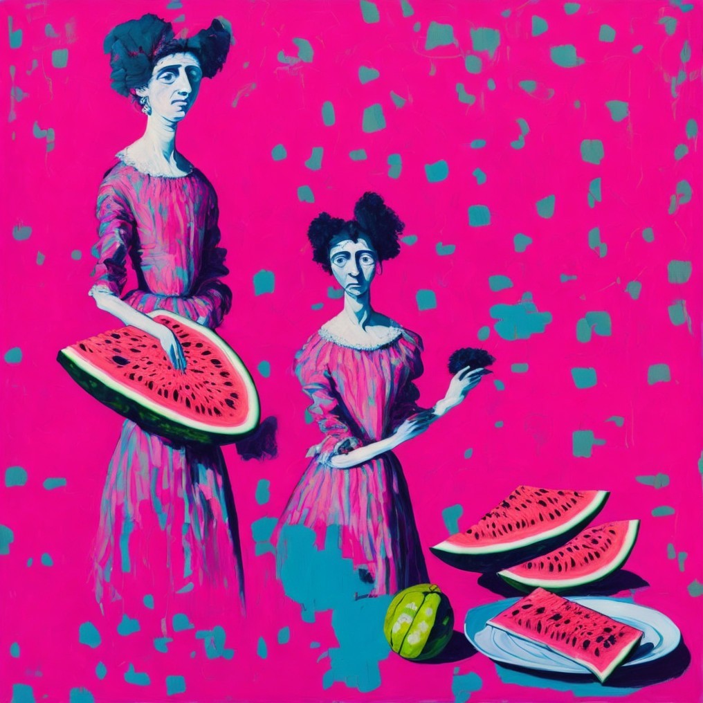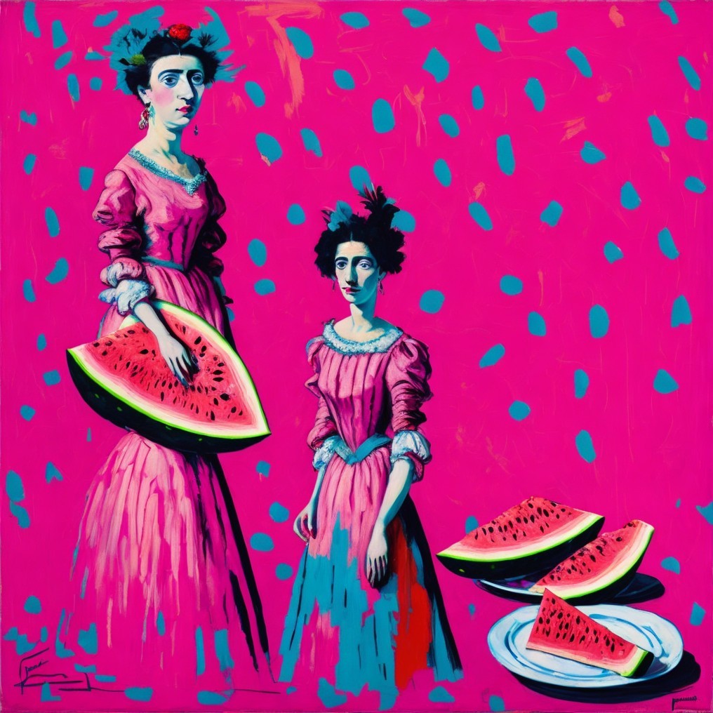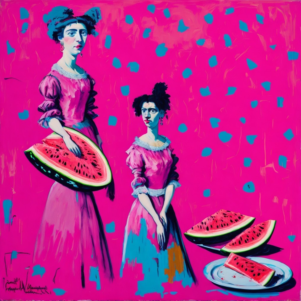 Artistic statement: Rooted in Pop Art and post-Dadaist symbolism, this image channels the graphic directness of Warhol and Lichtenstein, blended with Basquiat’s semantic layering. The watermelon motif flattens into emblematic repetition. Its smooth visual field masks conceptual depth—a commentary on consumption, identity, and aesthetic excess.
