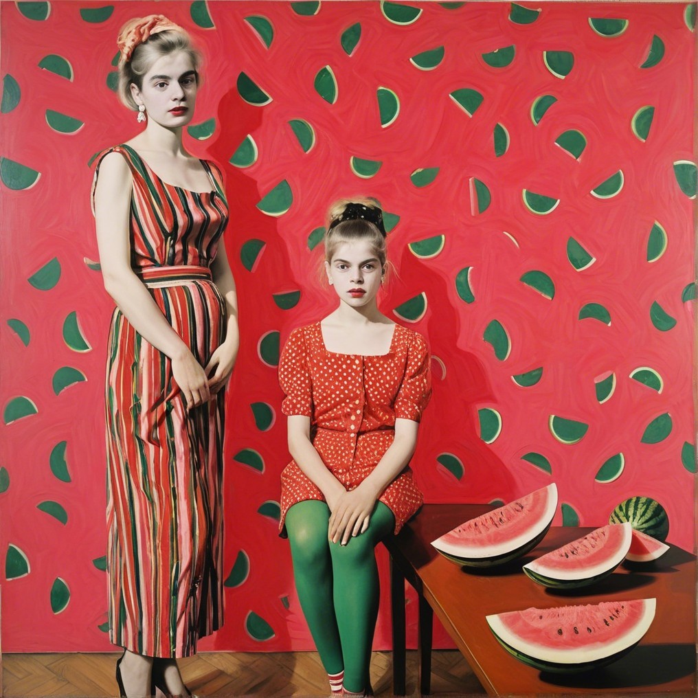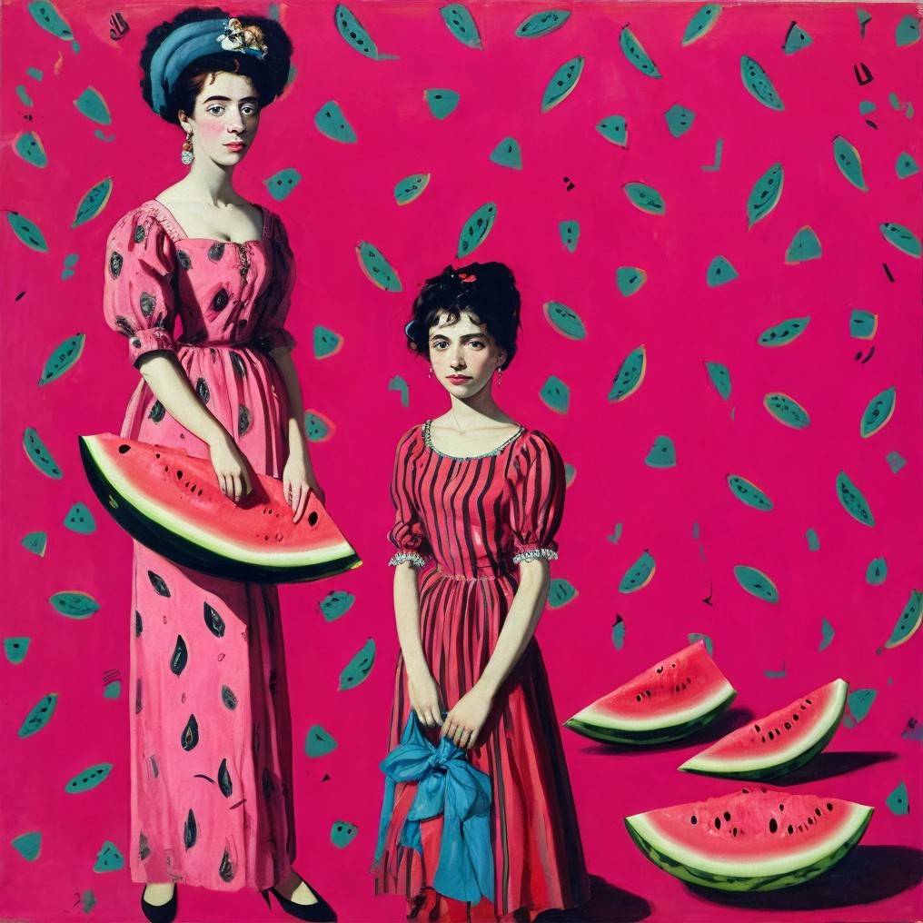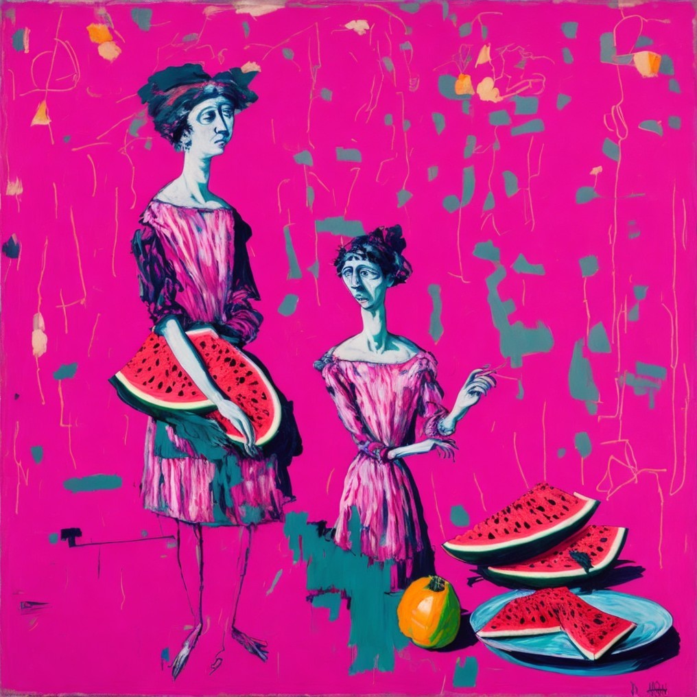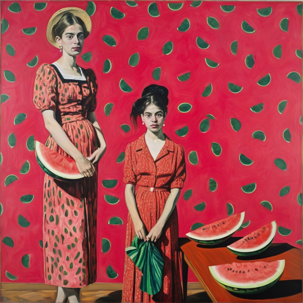 Artistic statement: Rooted in Pop Art and post-Dadaist symbolism, this image channels the graphic directness of Warhol and Lichtenstein, blended with Basquiat’s semantic layering. The watermelon motif flattens into emblematic repetition. Its smooth visual field masks conceptual depth—a commentary on consumption, identity, and aesthetic excess.