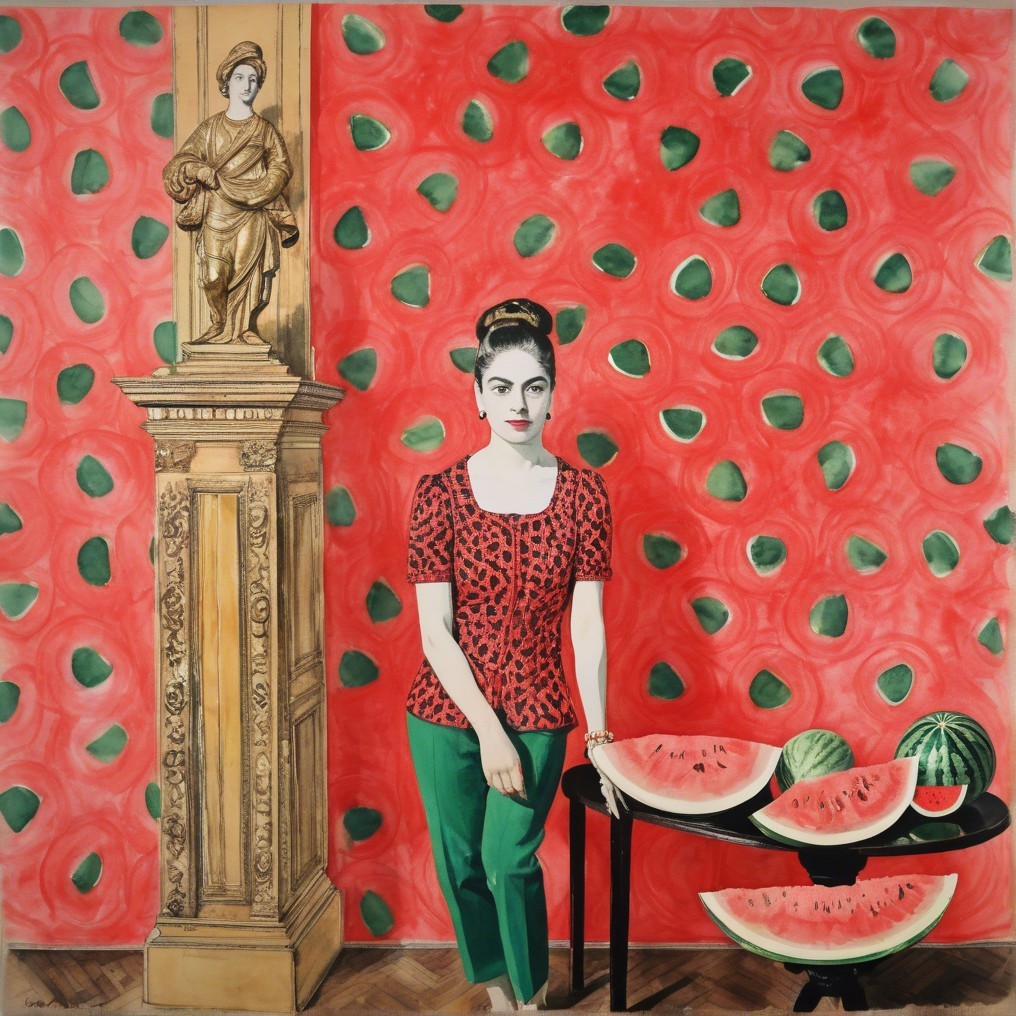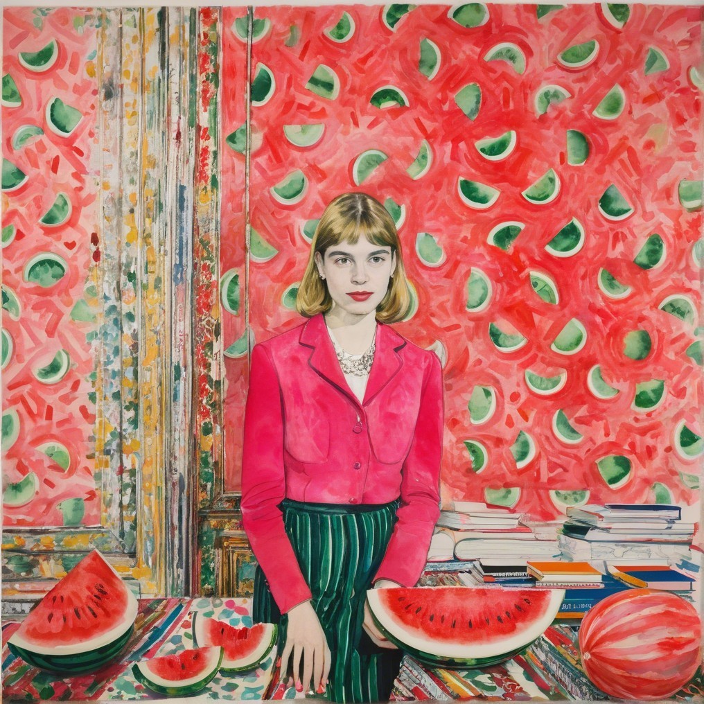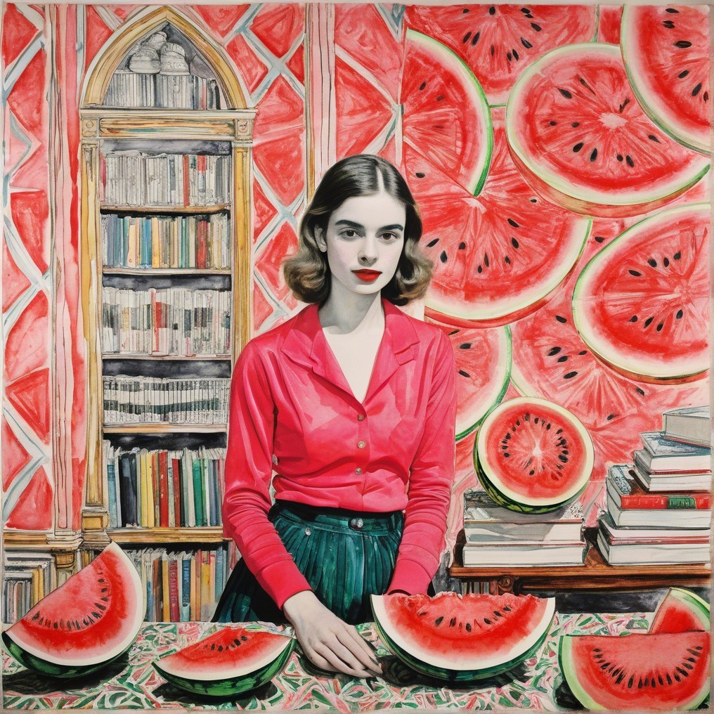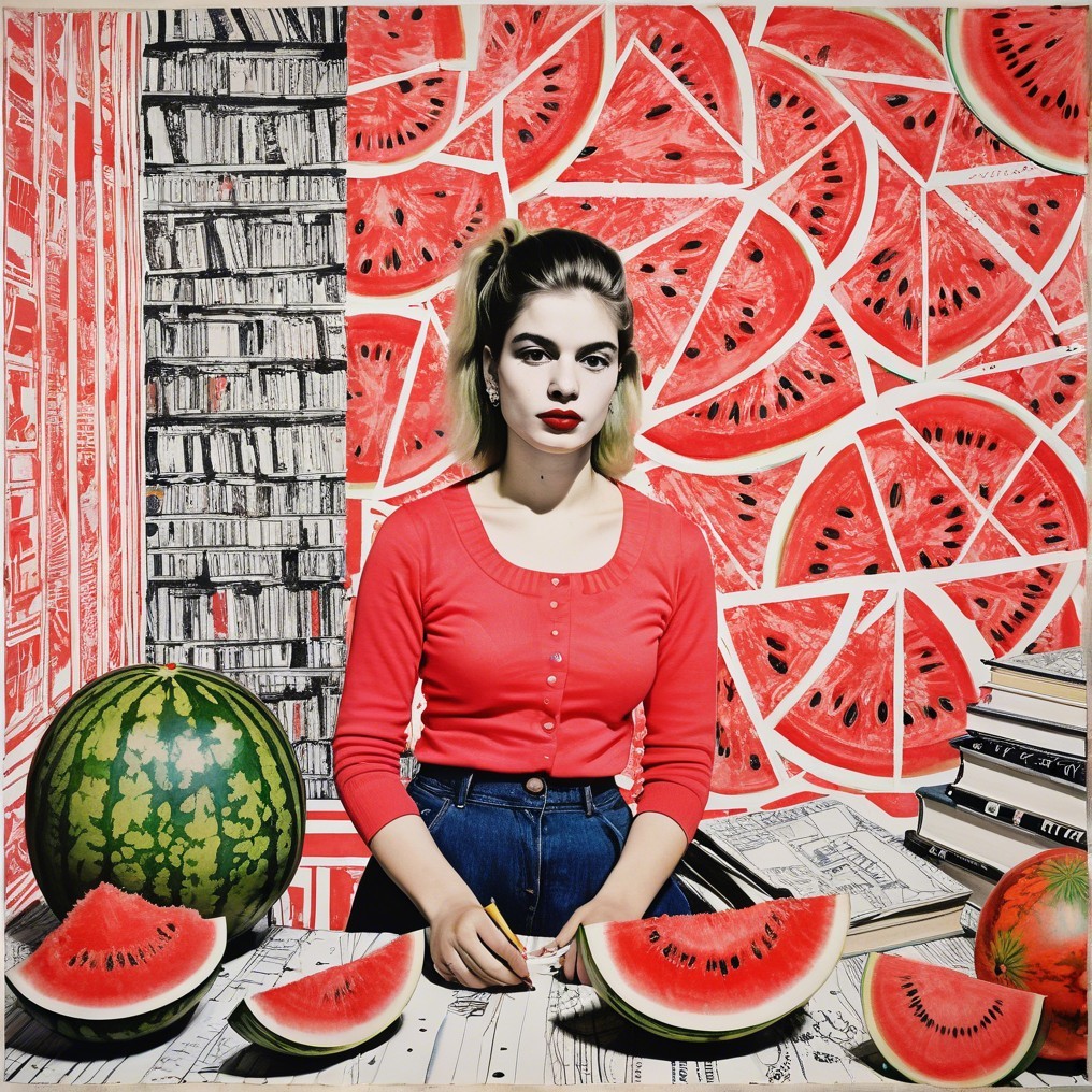 A hyper-stylized woman stands before a surreal feast of watermelon slices. Surrounded by patterned backdrops of red fruit and monochrome schematics, she is frozen in pop-icon clarity—half-hostess, half-myth—framed within a library of surface and symbol.