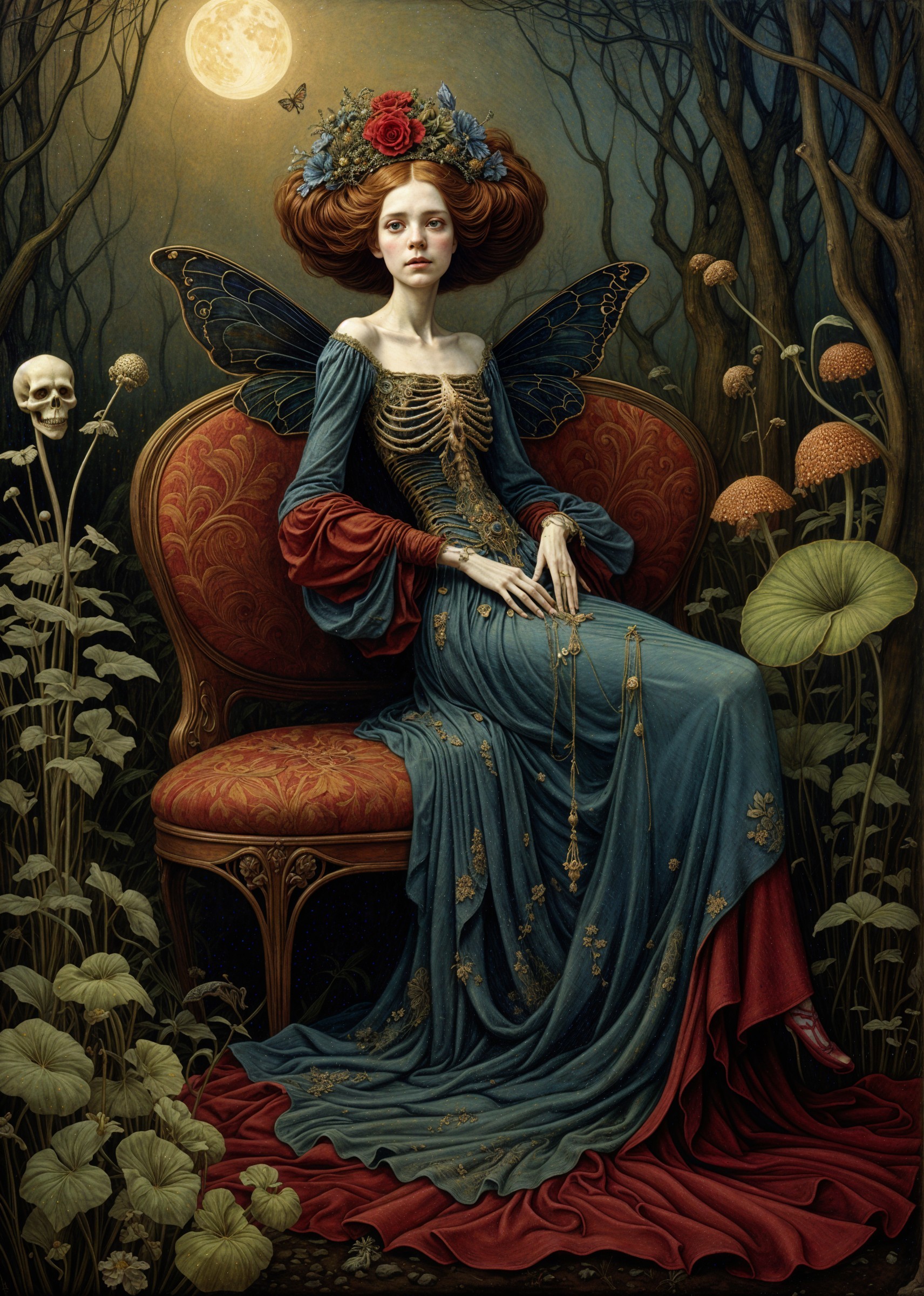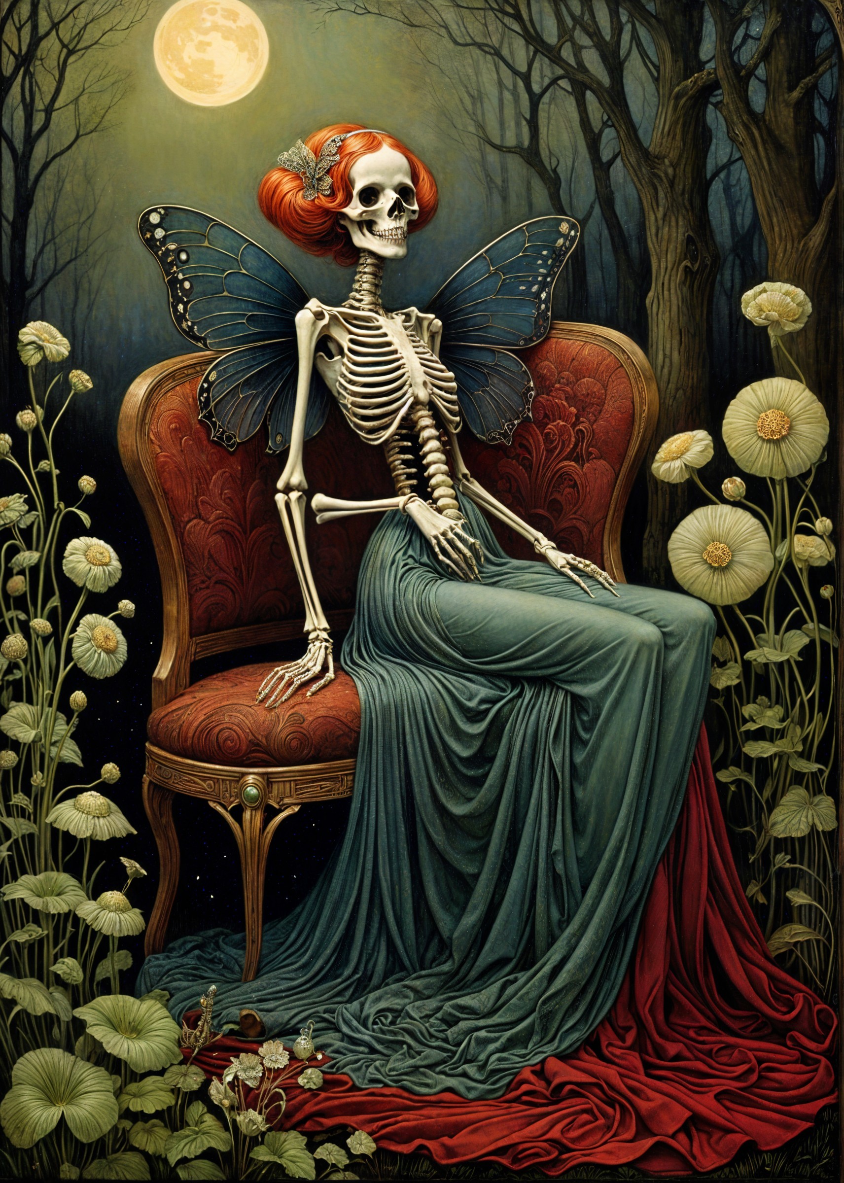 A whimsical skeleton fairy sits among vibrant flowers and pumpkins, adorned in flowing blue fabric. The moon casts a gentle glow, enhancing the enchanting, eerie atmosphere of the scene.