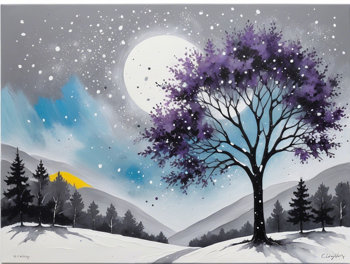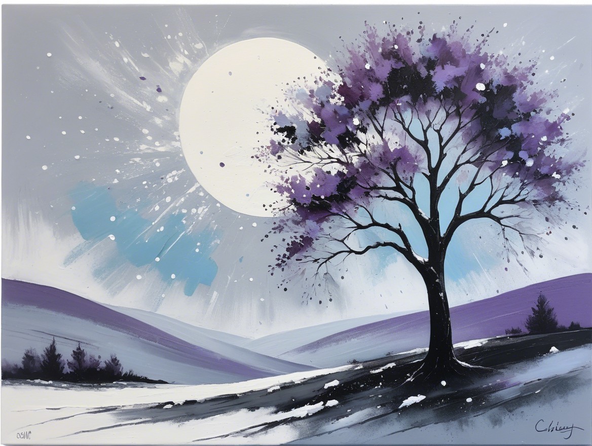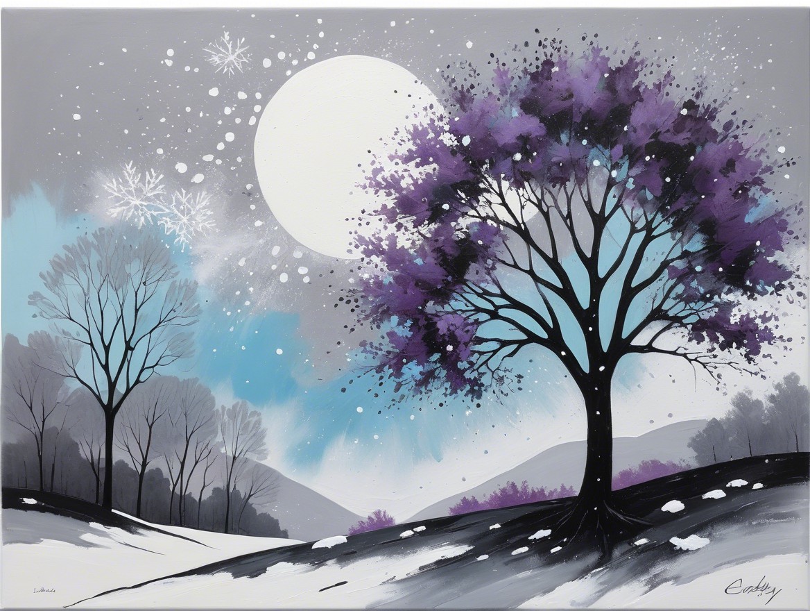 watercolor, wet on wet,less paint and loose water for a great effect, an abstract painting characterized by sweeping gestural strokes of charcoal and pencil, grey, soft yellow, soft purple and light blue colors, large starry snow flakes floating around, cloudy, no sun, winter night, dry grey tree with large snow flakes hanging, instead leaves.The artwork incorporates acrylic paints, pigment-muted ink, and plaster art. The minimalistic and impressionistic style is evident in the blurred abstract depiction of a serene landscape featuring a lone tree standing on a small piece of land or island. The tree's branches are predominantly bare, with large snow flakes instead of leaves, and some big snow flakes are suspended in the air, contrasting sharply against the darker charcoal tones, symbolizing resilience amidst solitude. Misty clouds hover just above the water’s surface in the background, adding a dreamy, ethereal quality to the scene. Below the tree, the calm water mirrors the silhouette of the tree and hovering clouds, enhancing the sense of stillness and tranquility. To the right of the tree, a small structure, a gazebo surrounded by fog, with a simple roof, adds a subtle architectural element. The background is filled with surreal distortions, such as soft, horizontal strokes that create depth and floating reflections. High art skilked creation