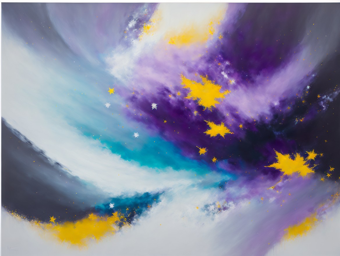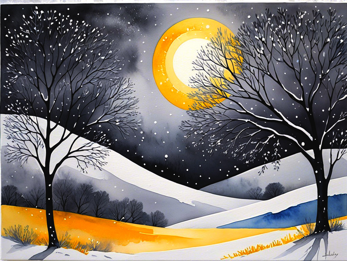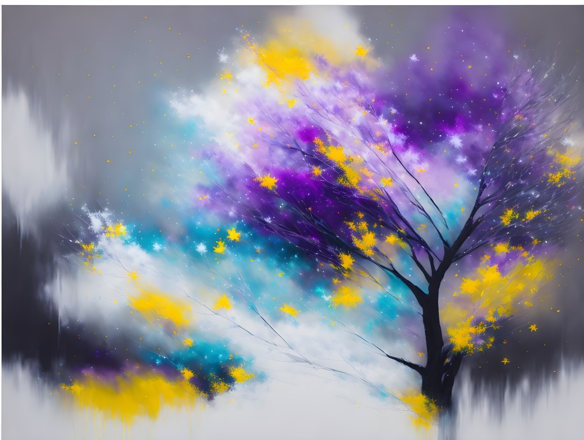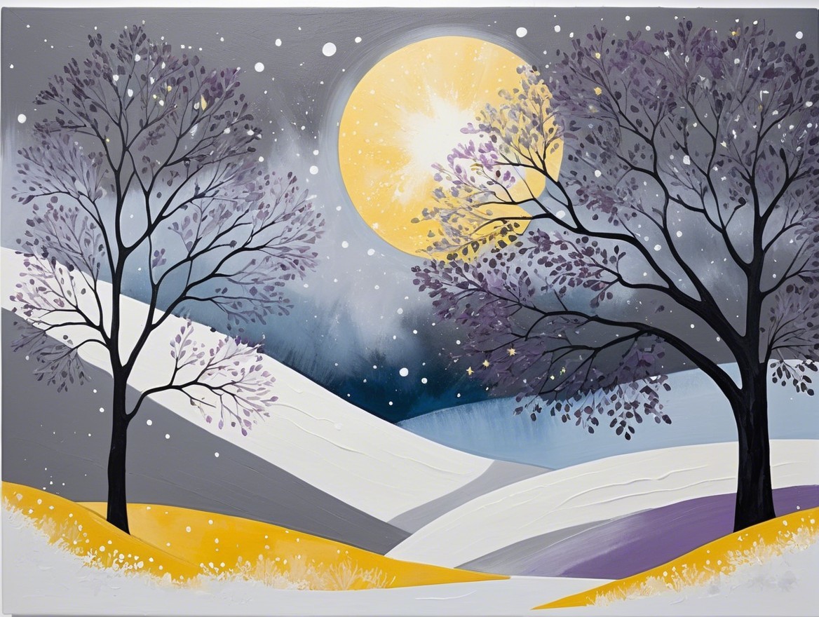 watercolor, wet on wet,less paint and loose water for a great effect, an abstract painting characterized by sweeping gestural strokes of charcoal and pencil, grey, soft yellow, soft purple and light blue colors, large starry snow flakes floating around, cloudy, no sun, winter night, dry grey tree with large snow flakes hanging, instead leaves.The artwork incorporates acrylic paints, pigment-muted ink, and plaster art. The minimalistic and impressionistic style is evident in the blurred abstract depiction of a serene landscape featuring a lone tree standing on a small piece of land or island. The tree's branches are predominantly bare, with large snow flakes instead of leaves, and some big snow flakes are suspended in the air, contrasting sharply against the darker charcoal tones, symbolizing resilience amidst solitude. Misty clouds hover just above the water’s surface in the background, adding a dreamy, ethereal quality to the scene. Below the tree, the calm water mirrors the silhouette of the tree and hovering clouds, enhancing the sense of stillness and tranquility. To the right of the tree, a small structure, a gazebo surrounded by fog, with a simple roof, adds a subtle architectural element. The background is filled with surreal distortions, such as soft, horizontal strokes that create depth and floating reflections. High art skilked creation
