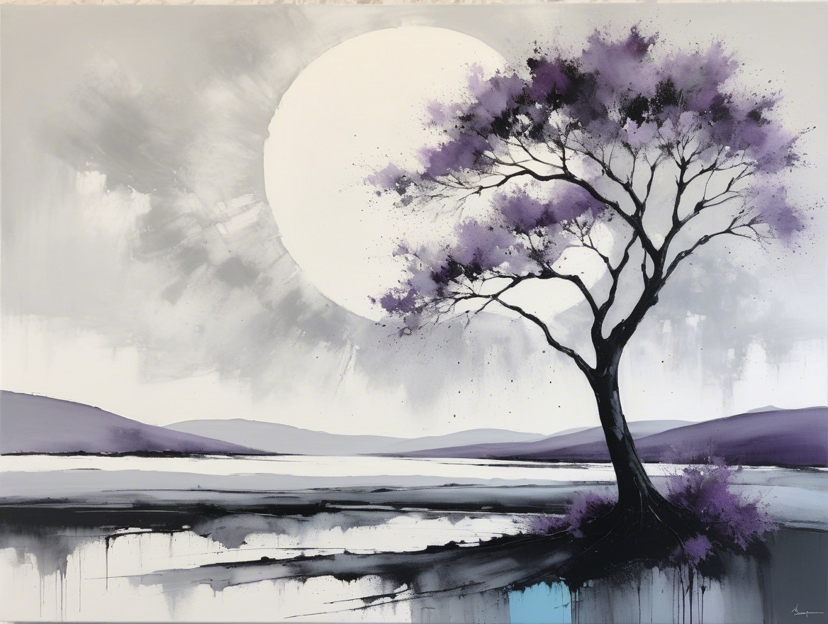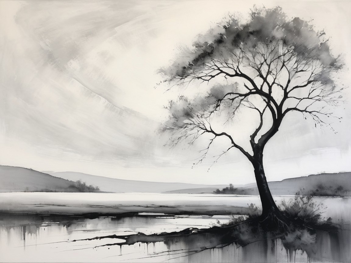 Prompt: "An abstract painting characterized by sweeping gestural strokes of charcoal and pencil. The artwork incorporates acrylic paints, pigment-muted ink, and plaster art. The minimalistic and impressionistic style is evident in the blurred abstract depiction of a serene landscape featuring a lone tree standing on a small piece of land or island. The tree's branches are predominantly bare, with large snow flakes instead of leaves, and some big snow flakes are suspended in the air, contrasting sharply against the darker charcoal tones, symbolizing resilience amidst solitude. Misty clouds hover just above the water’s surface in the background, adding a dreamy, ethereal quality to the scene. Below the tree, the calm water mirrors the silhouette of the tree and hovering clouds, enhancing the sense of stillness and tranquility. To the right of the tree, a small structure, a gazebo surrounded by fog, with a simple roof, adds a subtle architectural element. The background is filled with surreal distortions, such as soft, horizontal strokes that create depth and floating reflections. High art skilked creation"