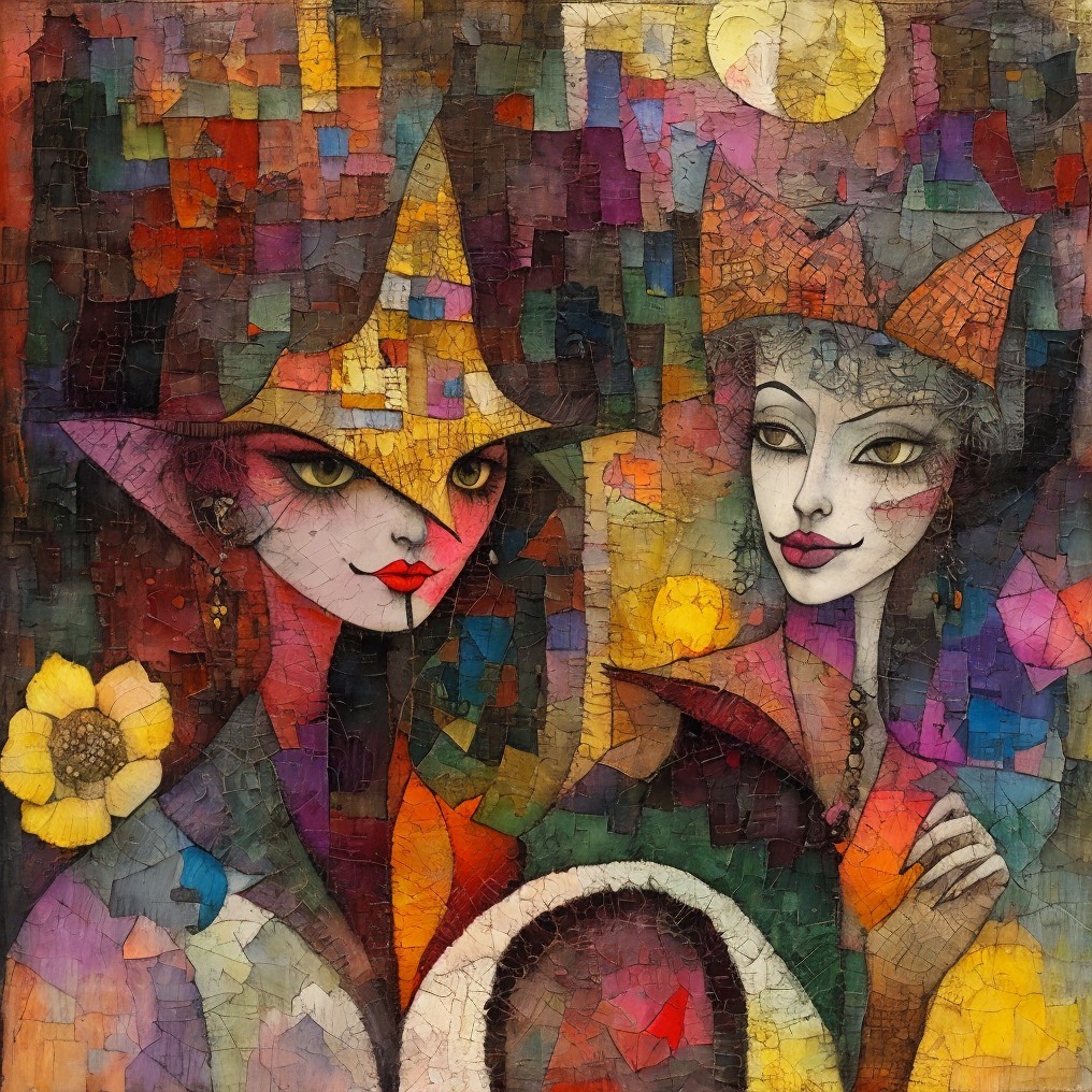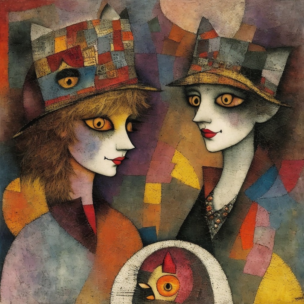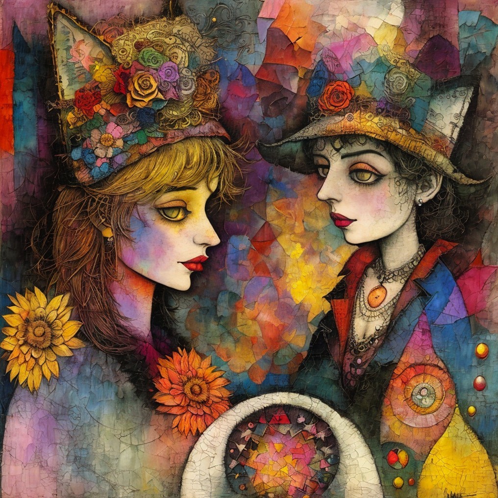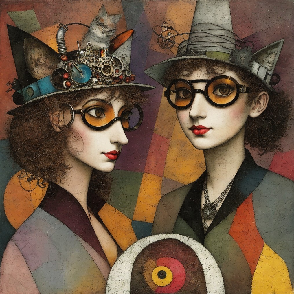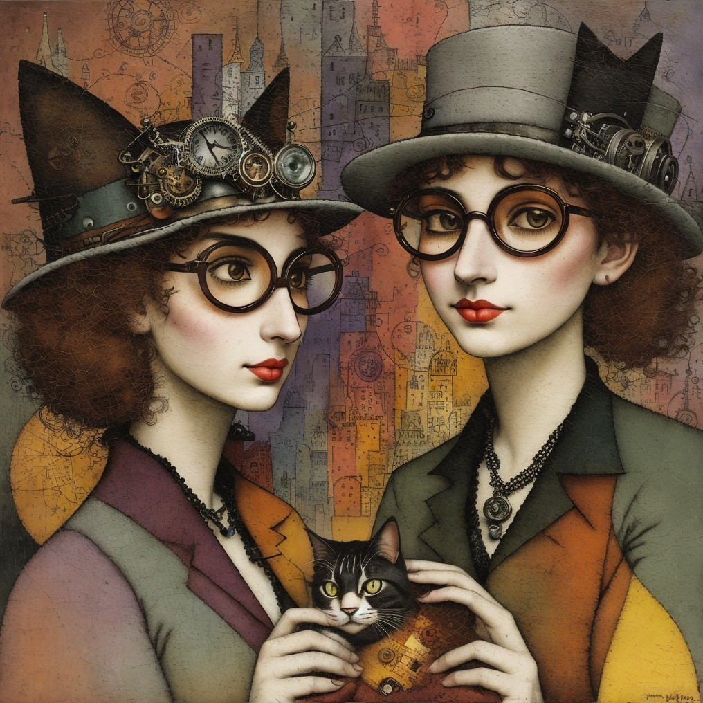 Two steampunk-styled women with top hats and glasses alongside a cat with goggles, against a mechanical backdrop.