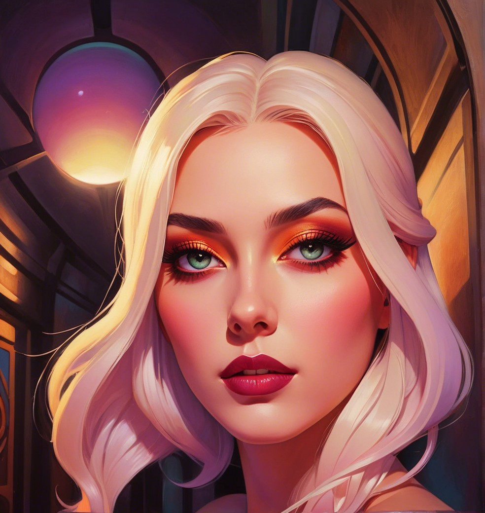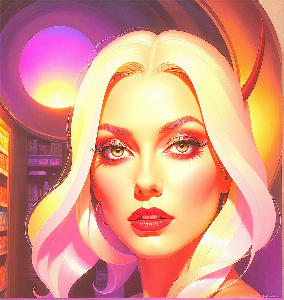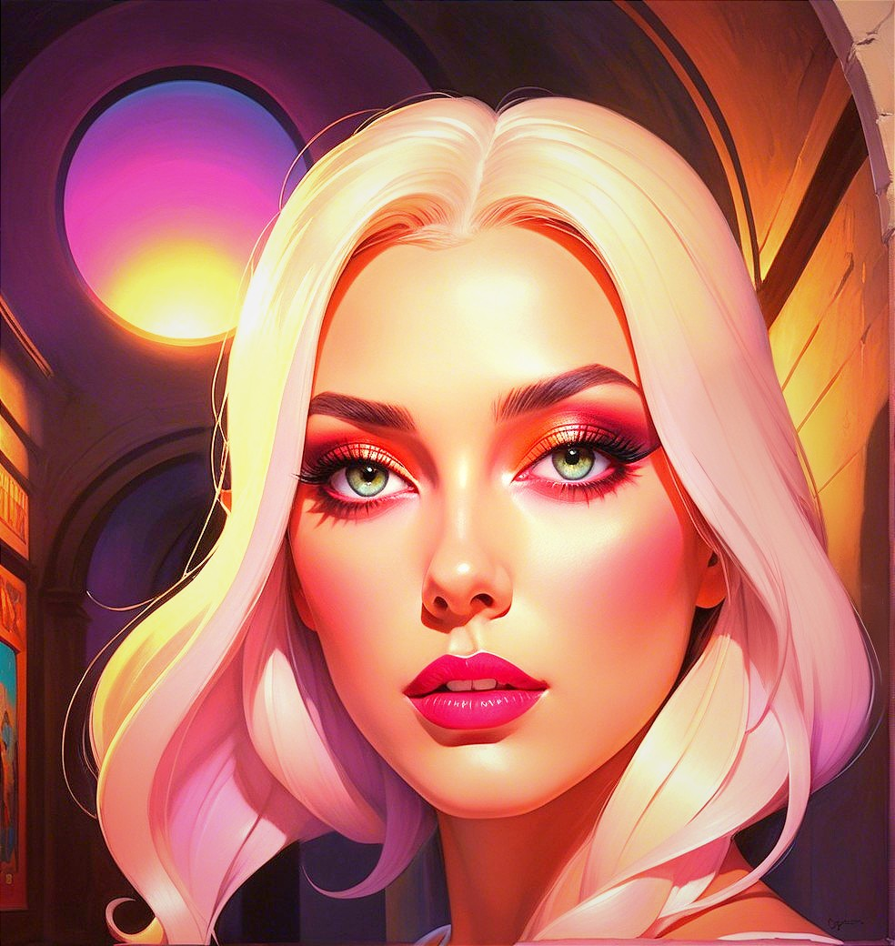 The image features a striking portrait of a woman with long, flowing blonde hair and vibrant pink makeup. Soft, colorful lighting creates an ethereal ambiance, enhancing her captivating gaze.