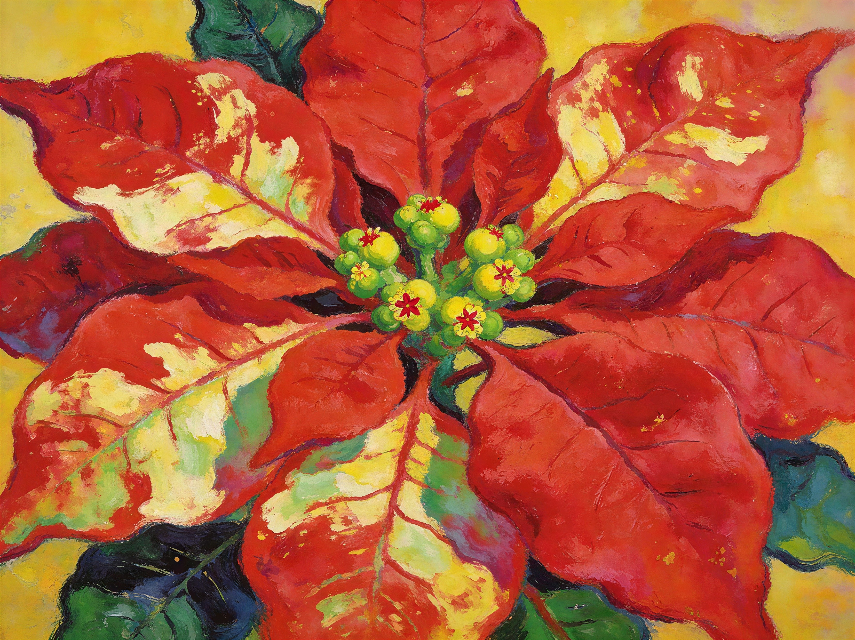 A close-up, top-down oil painting of a vibrant poinsettia plant, showcasing its brilliant red and yellow variegated bracts. The central cluster of small, greenish-yellow flowers with hints of red stamens is clearly visible. The large, red bracts exhibit irregular patches and streaks of