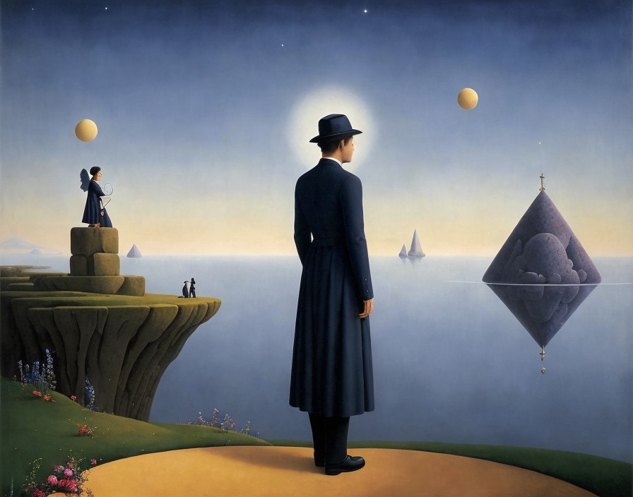 Two figures stand on a cliff, gazing at floating geometric shapes and soft-glowing orbs in a tranquil, surreal dusk landscape.