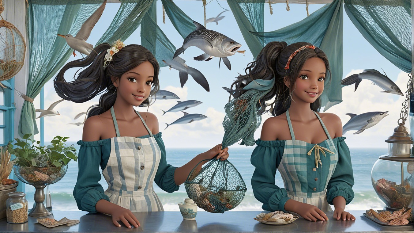 + Prompt:young sales girl in a charming fish shop Bright patchwork plants, coastal landscape, graceful seagulls in flight, billowing clouds overhead, intricate draping of a fishing net, young sales girl in a charming fish shop, detailed close-up of the counter displaying a variety of sea treasures - octopus, sturgeon, mackerel and crayfish, small Dalmatian dog peeking out from under the counter, rich colors combining blue, green and earth tones, soft natural lighting highlighting the beauty of the scene.