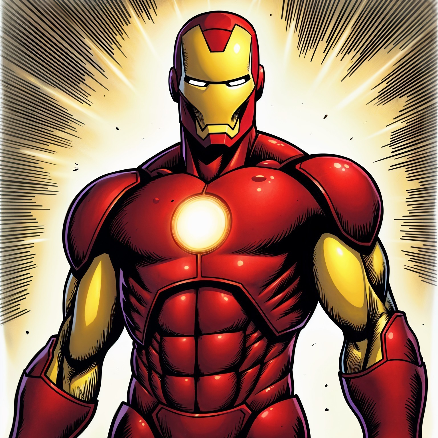 A powerful, muscular superhero in a bright red and gold suit, featuring a glowing chest emblem. Dynamic motion lines suggest speed and action, emphasizing his heroic presence.