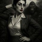 Prompt: black and white photo, open collar white satin blouse, buttoned grey wool business suit, gray skirt, tropical prehistoric jungle, green canopy, no sky, black hair in updo, one hand behind head, the other on hip, Angelica Huston face, smug expression, big gorgeous brown eyes, wireframe glasses, heavy black eyeliner, full-figured, very mature beautiful long nosed dark ethnic Armenian Fashion model age 45, beautiful mature full face, tiny mouth, red lips, King Kong approaching, dark ultra-realist Film Noir cinema