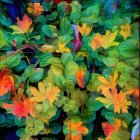 A vibrant display of autumn leaves in various shades of orange, yellow, red, and green, creating a rich tapestry of color against a deep blue background. It's a lively, dynamic composition.