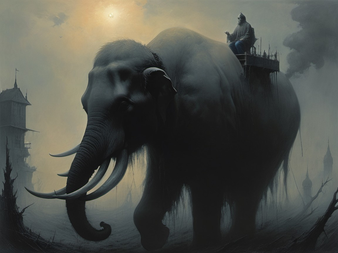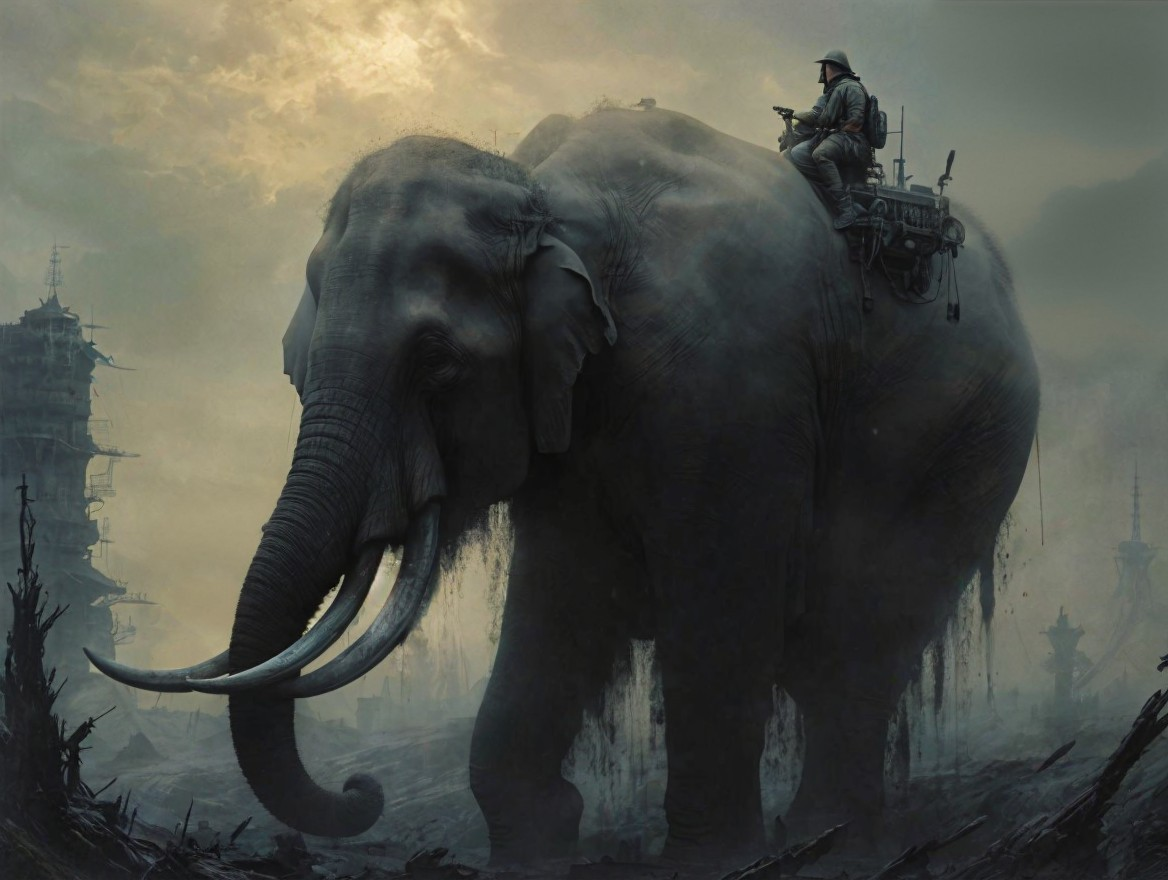A massive, futuristic elephant stands in a desolate landscape, with a heavily armed soldier riding on its back, amidst ruins and a moody, overcast sky. The scene evokes a sense of dystopia.