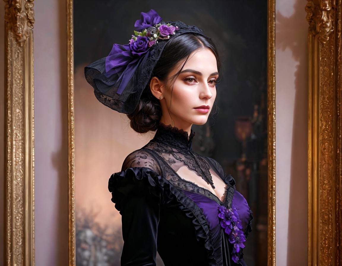 A elegantly dressed woman in an ornate gown with lace details and a striking purple bow in her hair, stands in front of a gilded frame, embodying a vintage, sophisticated charm.