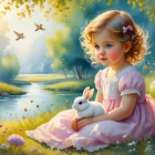 A young girl with curly blonde hair sits by a tranquil stream, gently holding a white bunny. Surrounded by vibrant flowers and sunlight filtering through trees, the scene exudes warmth and innocence.