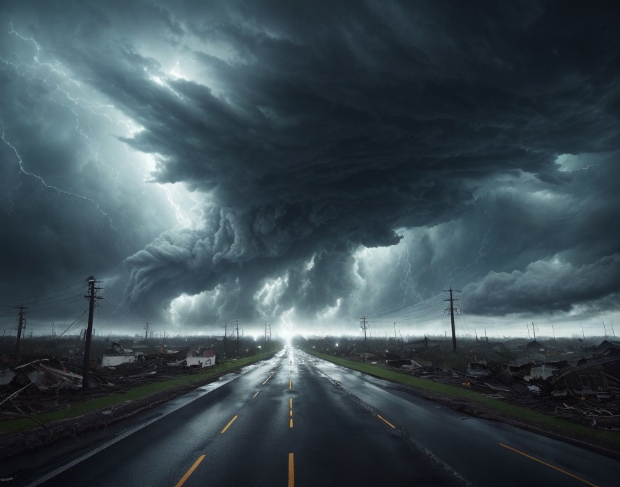 Prompt: "Roaring tornado, swirling dark clouds, debris flying, uprooted trees, destroyed buildings, dramatic sky, chaotic winds, ominous atmosphere, power lines down, cars tossed around, intense weather conditions, digital illustration, realistic with a touch of surrealism, high detail, dynamic composition, contrast of light and dark, by Simon Stålenhag and Wojtek Fus, Artstation."
