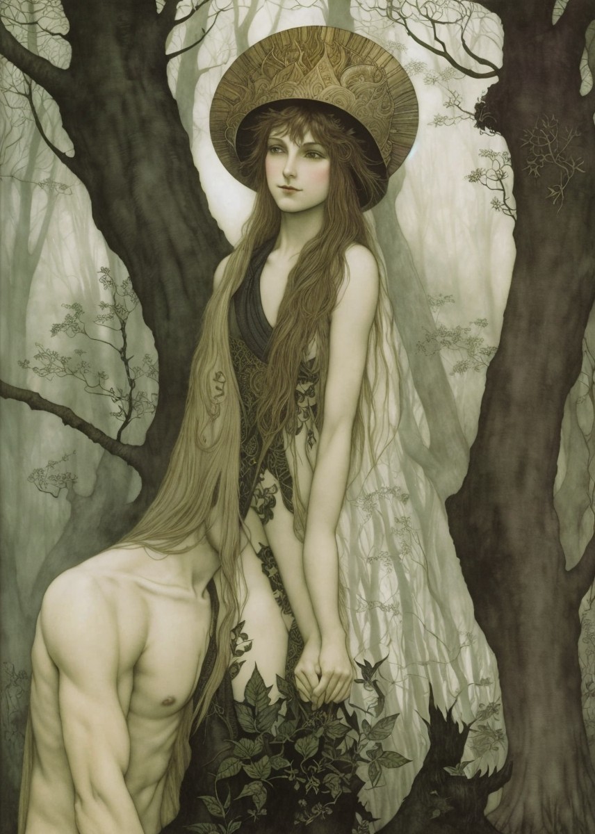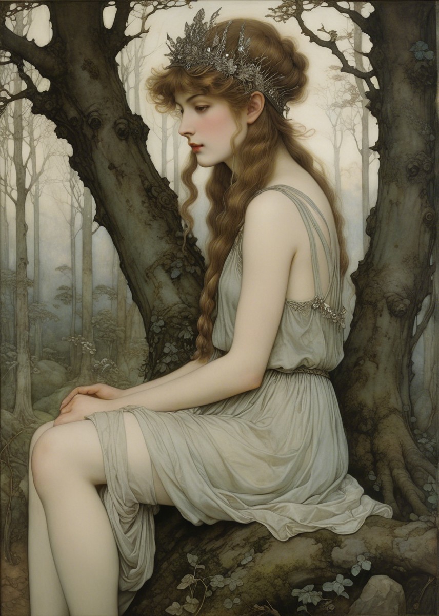 A serene young woman with flowing hair and a floral crown sits gracefully among ancient trees. She wears a flowing gown, exuding a mystical aura, illuminated by a soft, glowing background.