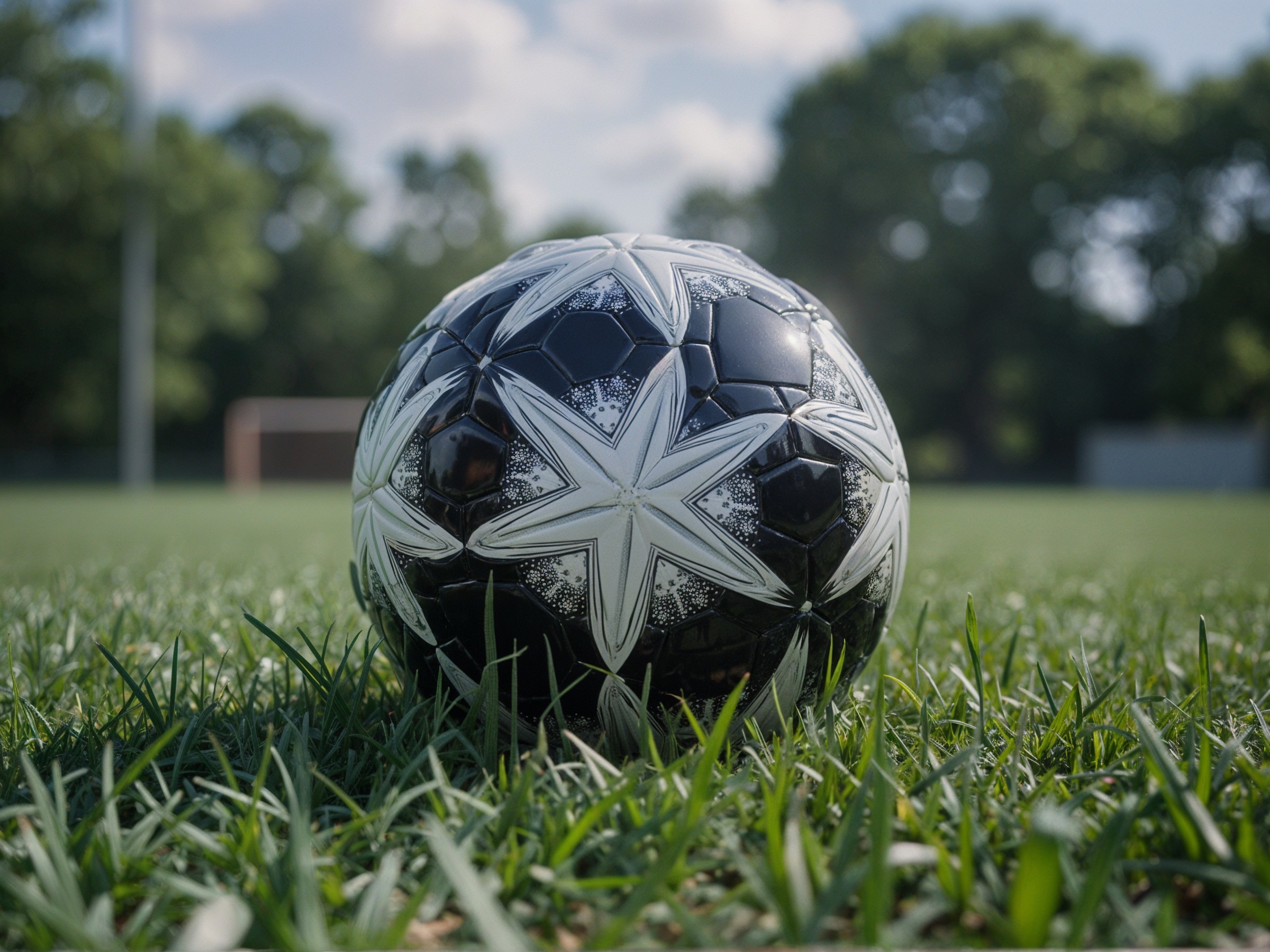 A close-up of a vibrant soccer ball resting on lush green grass, with a stadium in the background. The sky is partly cloudy, creating a lively atmosphere for a game.