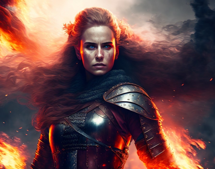 Warrior woman in medieval armor with blue eyes and dark hair in fiery setting