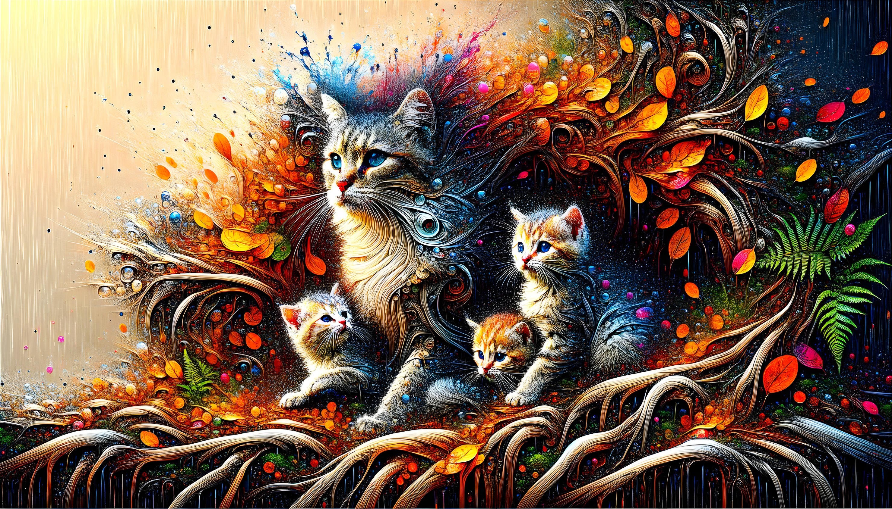 A vibrant digital artwork featuring an adult cat with three kittens amidst a colorful, fantastical flora background.