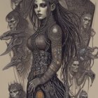 A dark fantasy scene featuring a striking female character with long, flowing black hair, adorned in ornate, intricate armor that blends elements of elegance and strength. She stands in a powerful pose in the foreground, showcasing detailed metallic designs and ancient symbols on her attire. Behind her, a haunting array of mythical figures and warriors, each with distinct features and expressions, create an atmosphere of mystery and foreboding. The background is filled with shadowy hints of an ancient, otherworldly realm, enhancing the mystical and dramatic tone of the artwork.