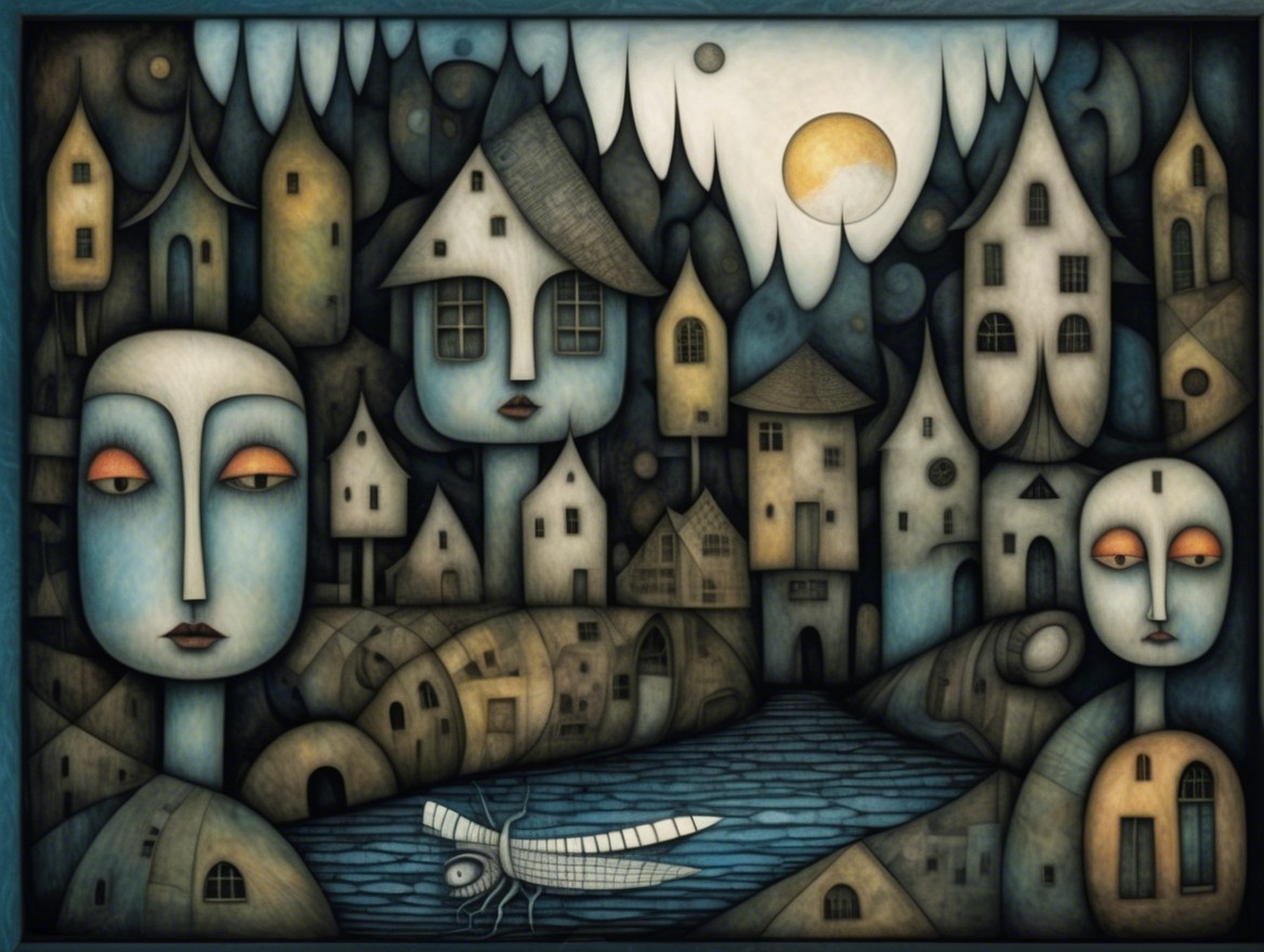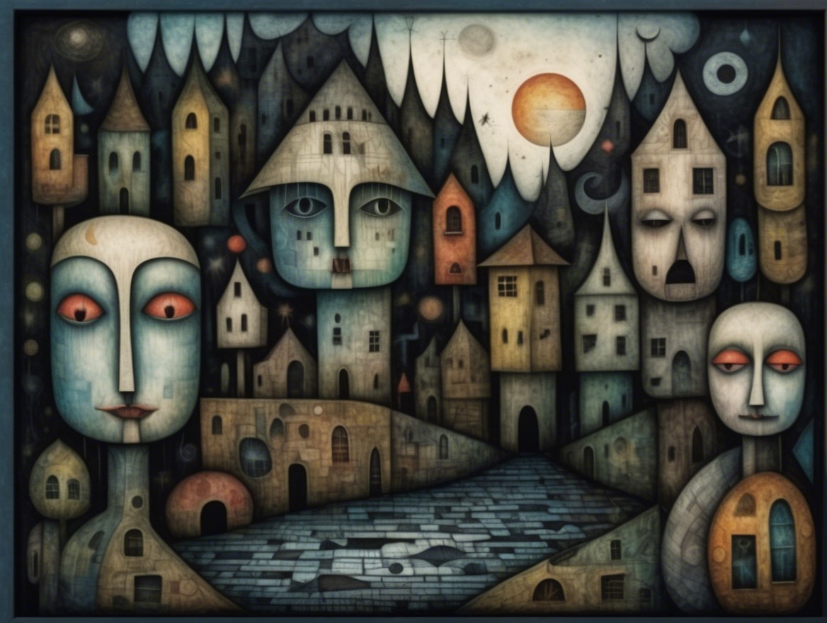 The image features a surreal landscape with abstract figures and whimsical architecture. Eerie faces with striking features loom over a stylized village under a vibrant sky, blending mystery and intrigue.