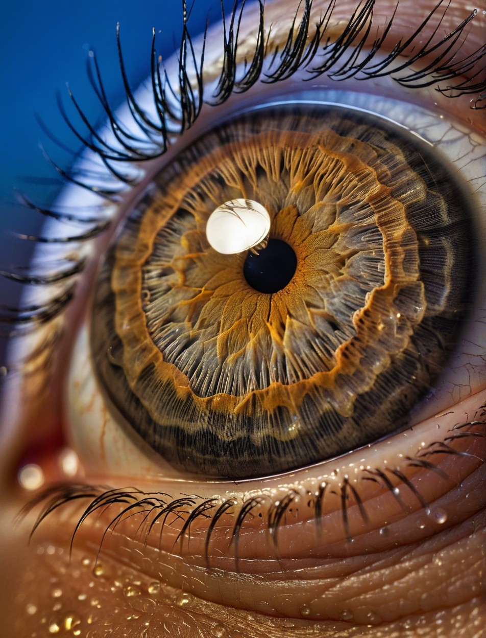 A macro shot of a human eye with intricate details in the iris, which displays a mesmerizing blend of colors, gold, orange, and gray patterns radiating from the black pupil like microscopic, spiky waves. The pupil is perfectly round, reflecting a bright white light source. The eyelashes, long and dark