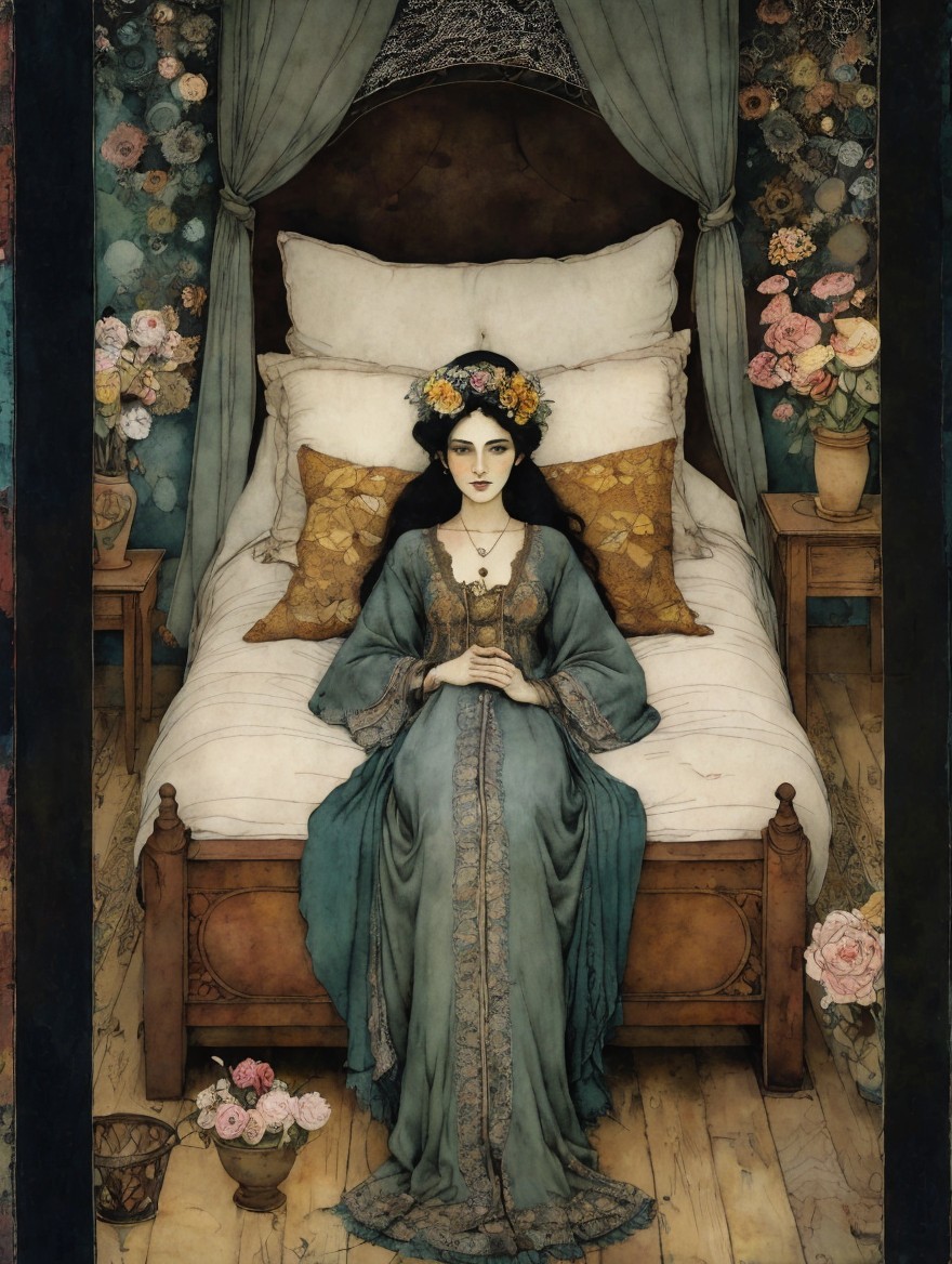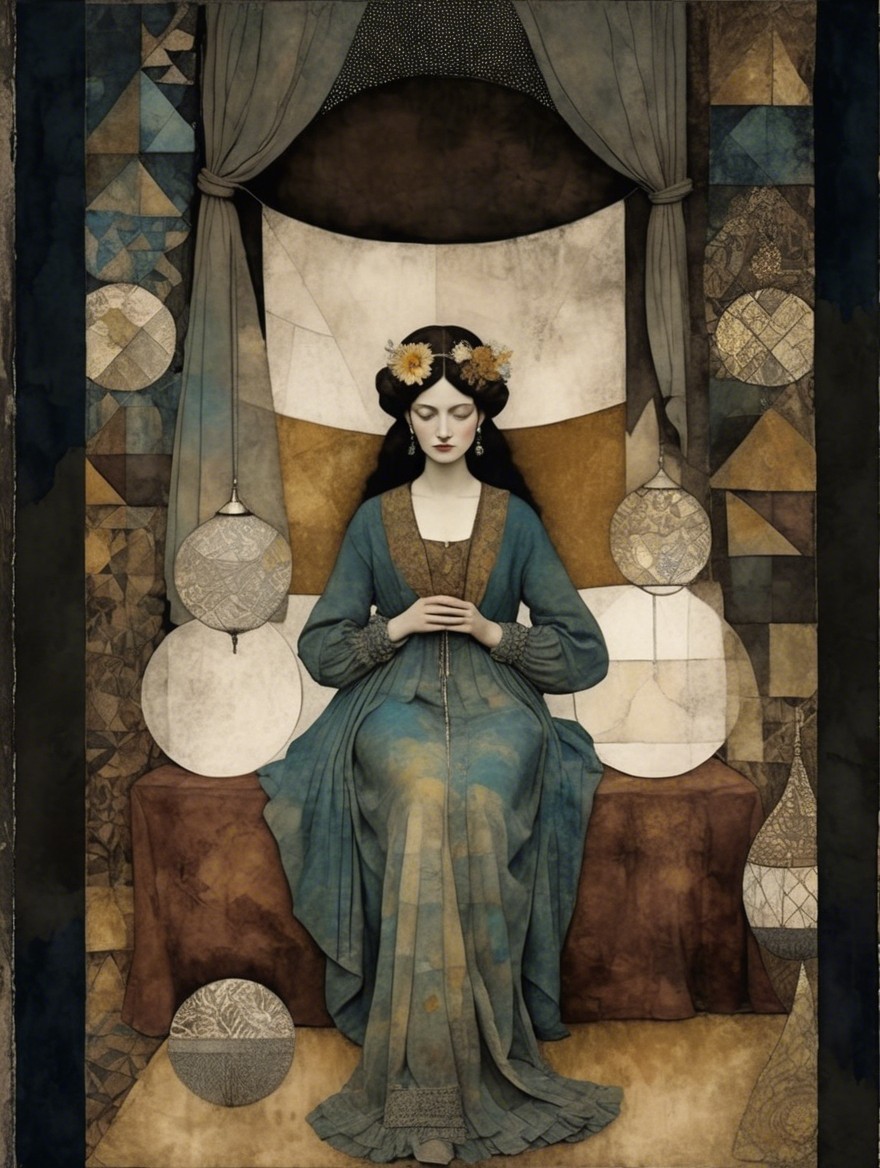 A somber young woman sits elegantly in a vintage dress with a wide-brimmed hat. Her serene expression contrasts with the abstract, earthy backdrop of shapes and muted colors.