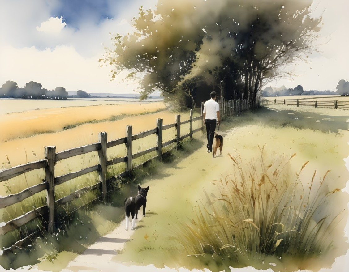 A man taking his dogs for a walk through the countryside on a lovely summer's day.