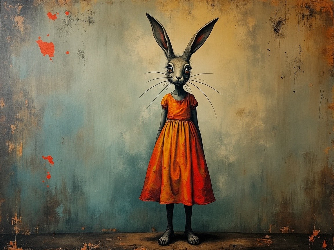 A whimsical artwork featuring a humanoid rabbit in a bright orange dress standing against a textured, colorful backdrop, with flowers in a vase nearby, merging fantasy and surrealism.