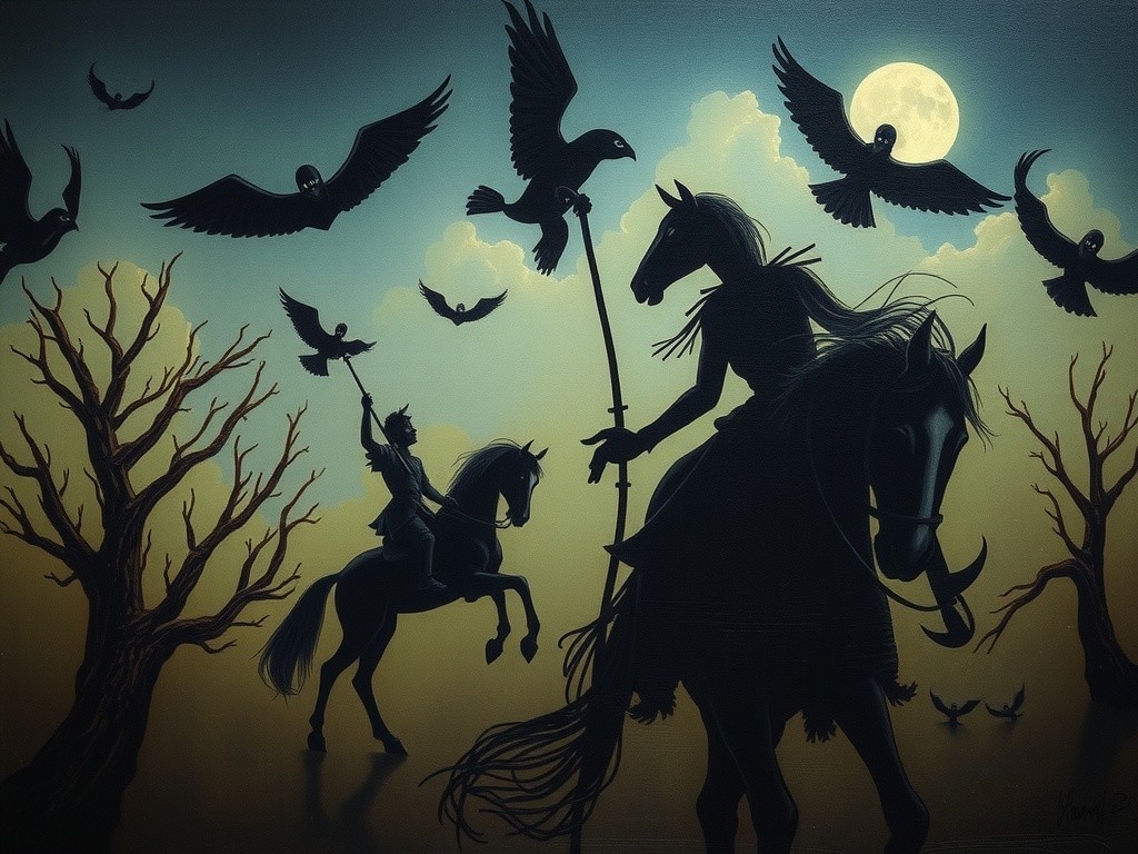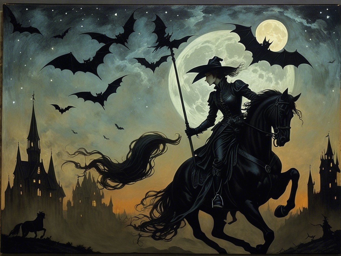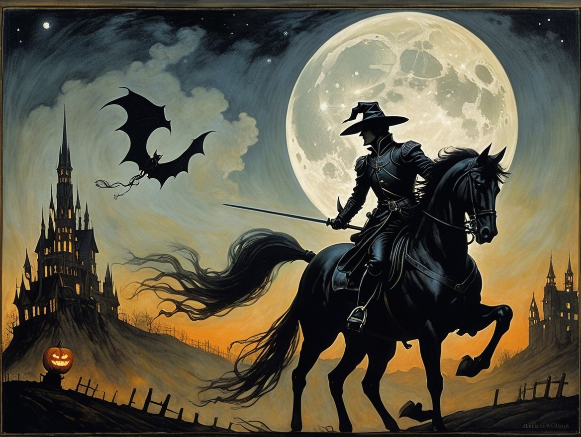 A silhouette of a cloaked figure on a black horse, set against a bright full moon. Nearby, carved pumpkins glow, and a mysterious castle looms in the dark, spooky landscape.