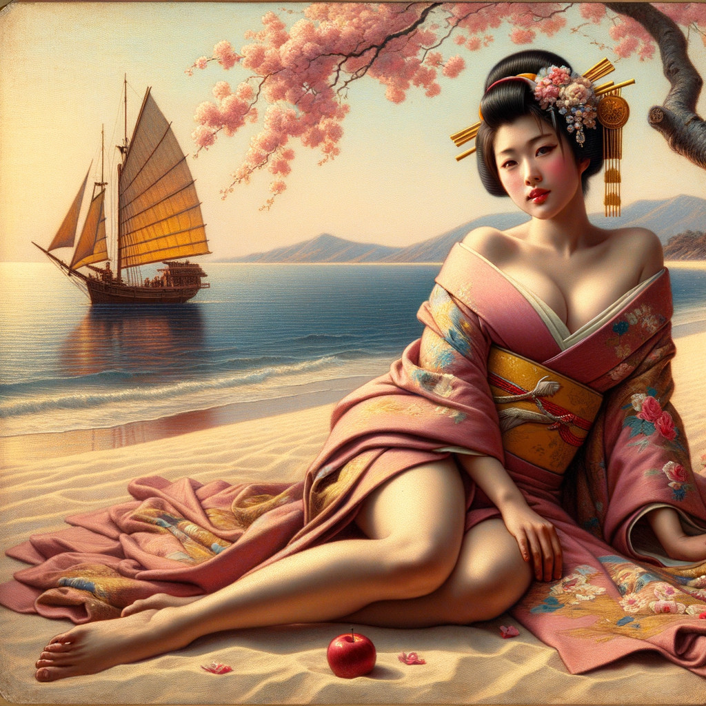 A serene beach scene features a woman in a beautiful pink kimono, sitting gracefully on the sand. Cherry blossoms frame the view, while a traditional sailboat floats gently on the calm water.