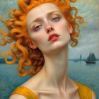 A digital painting depicts a woman with pale skin, prominent cheekbones, light lips, and bright blue eyes, framed by voluminous, red-orange curly hair cascading around her shoulders and back. She gazes directly at the viewer with a serious but captivating expression. Her neck is gracefully elongated, and her Orginal Prompt:EmmAI