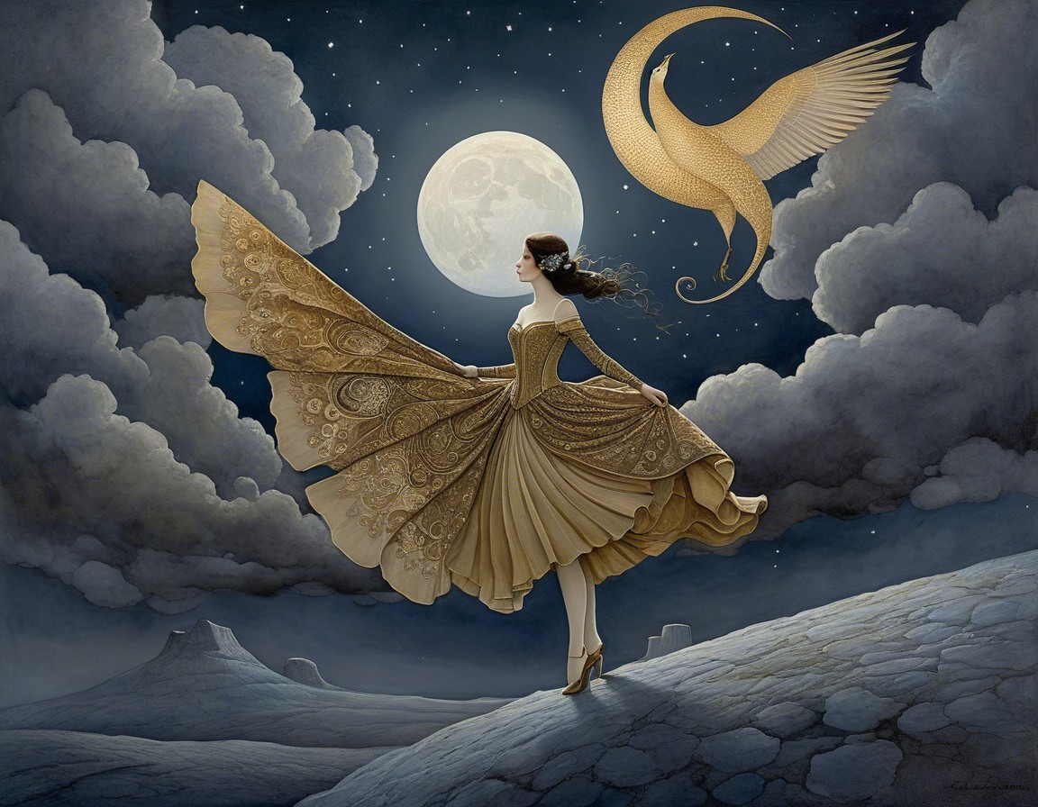 A serene figure in a flowing gown sits gracefully on a crescent moon, surrounded by shimmering planets and stars, sailing over a tranquil sea, with a distant ship hinting at adventure.