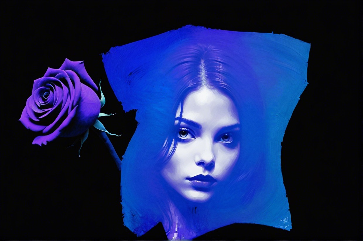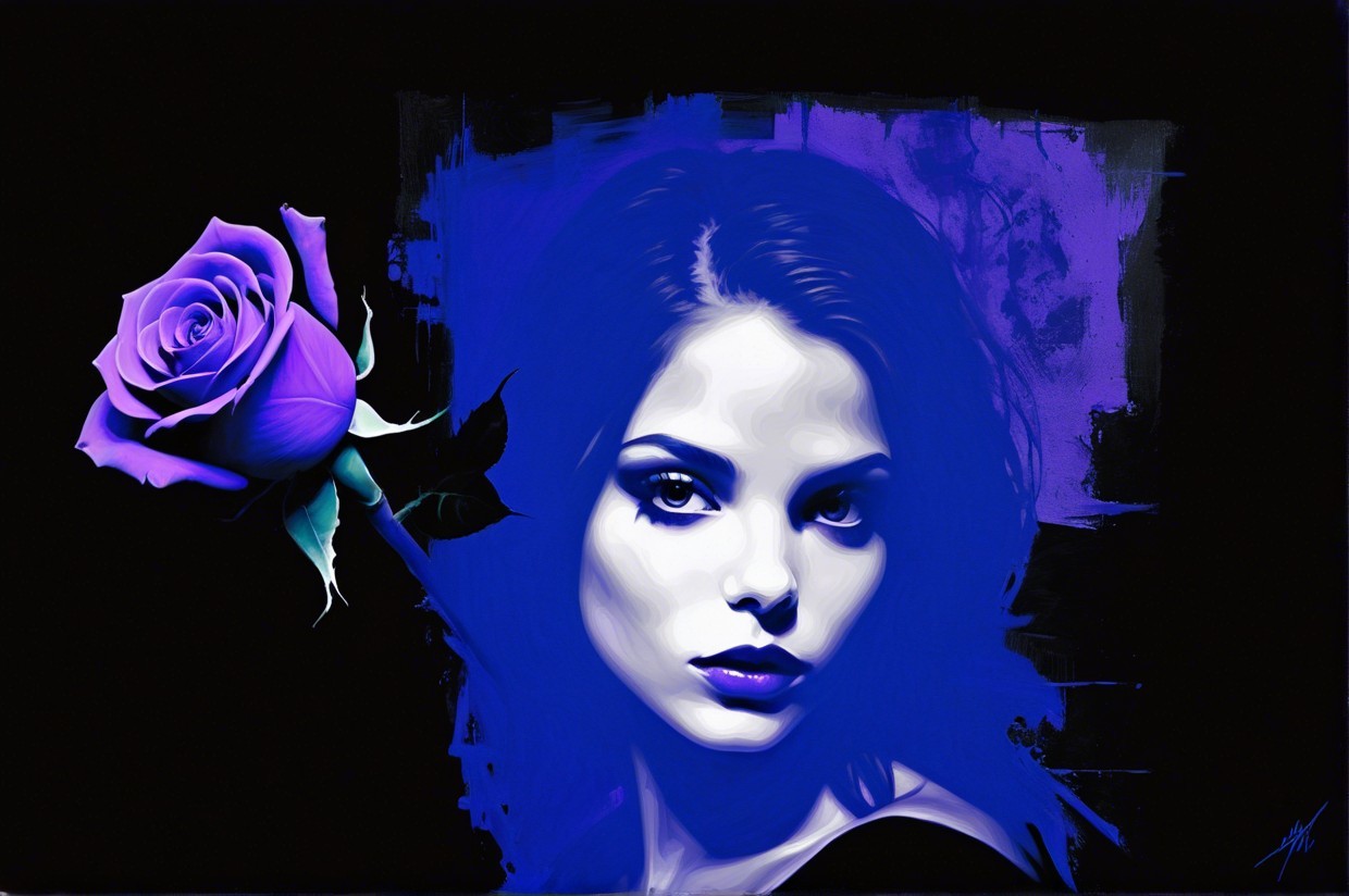 + Prompt:portrait, girl with a purple rose, black and white impasto oil painting, dark, abstract, ominous, style of Dave McKean, Christopher Bucklow, Stephen Gammell and Jeremy Mann
