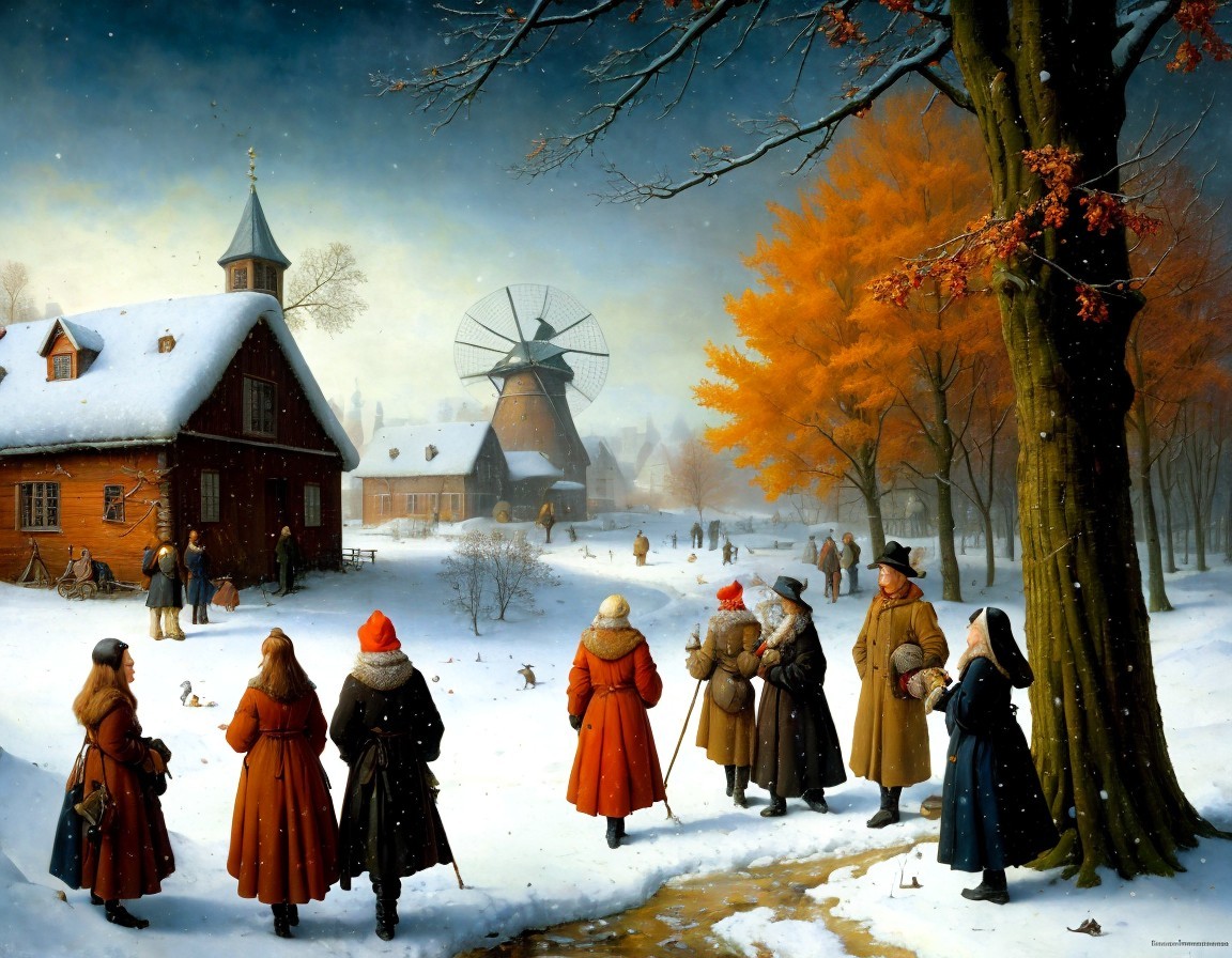 Wintertime in the Netherlands. Surreal people in autumn colours against a snowy landscape background, in the style of Breughel.