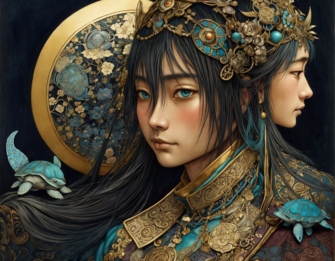 Legend of the boy and the blue turtle, Medieval Japanese Artists Sumi-e Style, Velvet Black, Shabby, Dull Gold, turquoise, Amber Gray, Golden Ratio, Surreal Fantasy, Elegant, High Definition Ultra Fine 3D Line, Zenangle Style, Watercolor Patchwork , Arthur Rackham Style, Paul Kidby, Gediminas Prankevicius, Jacek Jerka, Extremely Detailed, Intricate, Thoughtful, HDR, Fractal, Beautiful, Award Winning, Fantasy Look, Fantasy, Crisp Quality