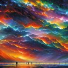 A vibrant pixel-art scene captures a large sun setting over a calm waterbody, surrounded by stylized clouds and wind turbines. Silhouetted figures stand on the shore, enjoying the view.