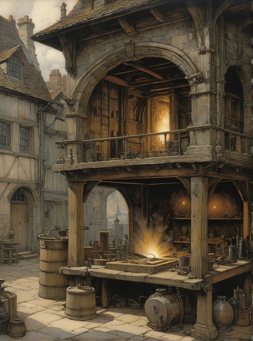 The image depicts a medieval workshop, with intricate architecture and vibrant flames bursting from a forge. Tools and containers are scattered throughout, suggesting active craftsmanship and alchemy.