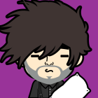 The image features a stylized character with spiky black hair and a futuristic, reflective face design. The background is vibrant purple, enhancing the character's cybernetic aesthetic.