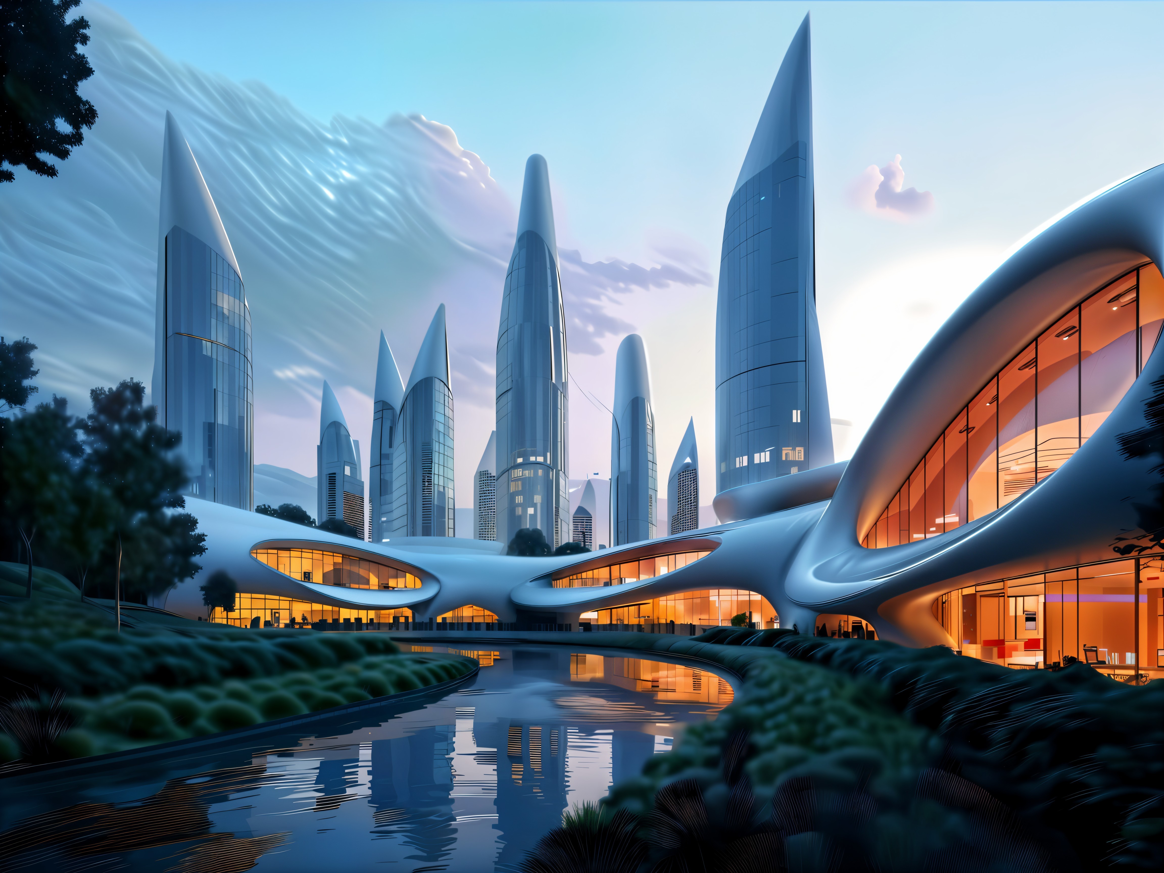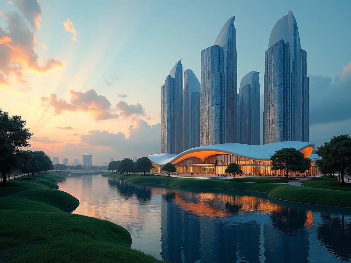 A serene landscape featuring futuristic skyscrapers with sleek, curved designs. A modern, white structure sits by a calm water body, surrounded by lush greenery, under a soft pastel sky.