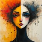 The artwork features a split face, one side in warm yellows and oranges, the other in cool greys and blacks. The stylized eyes are striking, conveying contrasting emotions and themes of duality.