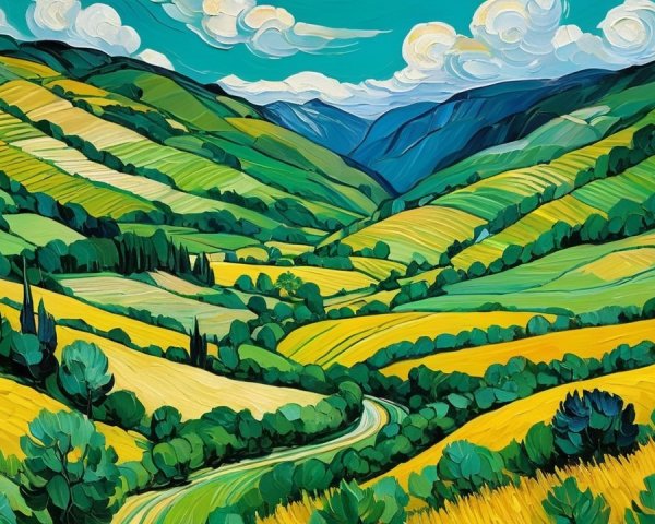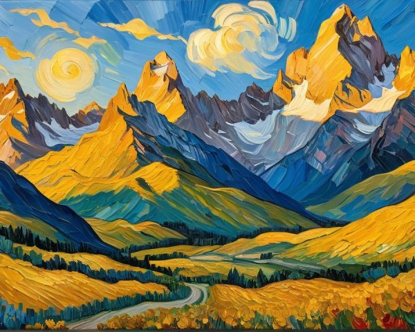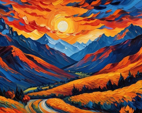 A vibrant, colorful skyline of New York City showcases the Empire State Building against a radiant sunset. Boats glide on the water, surrounded by bold hues and swirling clouds, capturing city life.