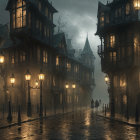A dimly lit, eerie street features cobblestone paths and twisted trees. Fog envelops the scene as old lanterns cast a warm glow against gothic architecture under a stormy sky.