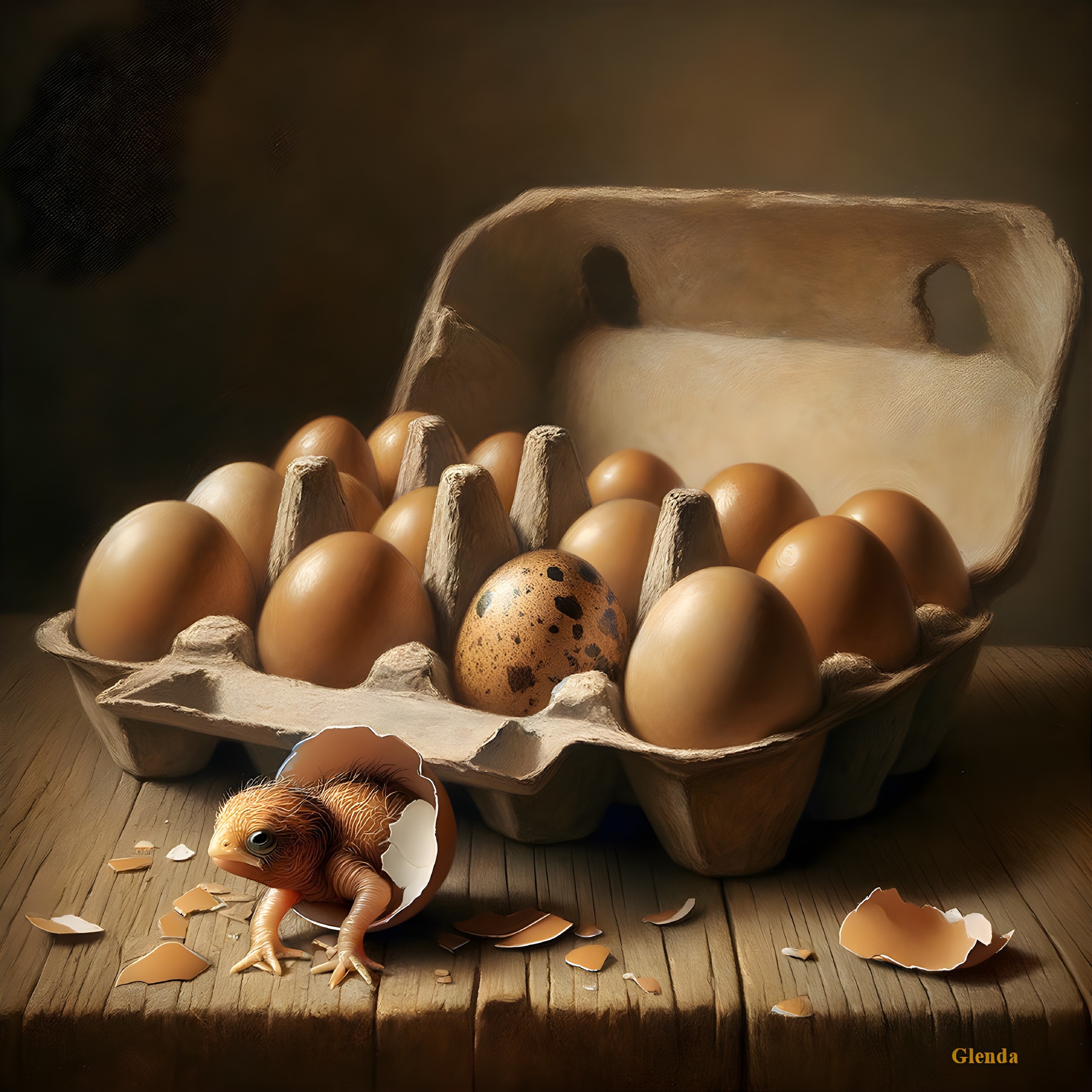 A newborn critter emerges from an eggshell near a carton of eggs, blending fantasy with reality in a whimsical scene.