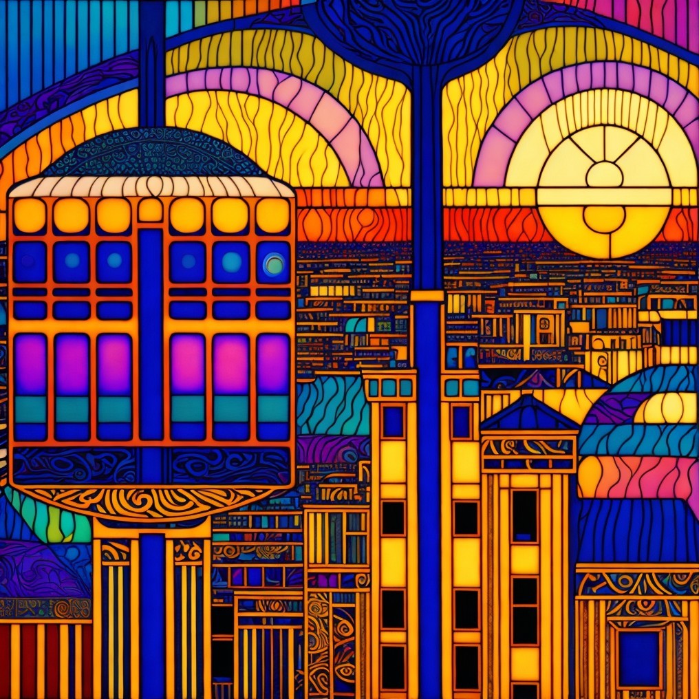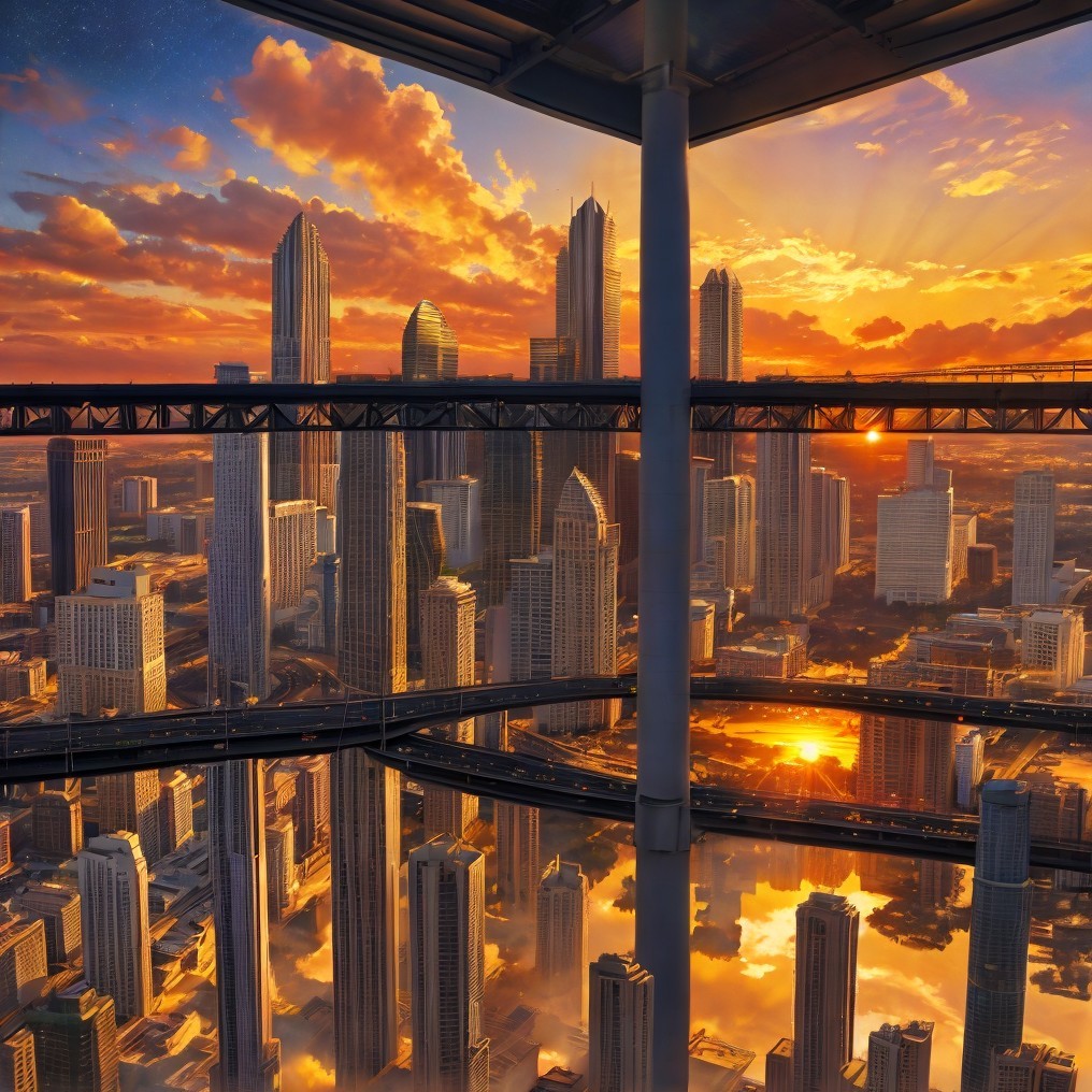 A stunning sunset over a city skyline, with tall modern skyscrapers reflecting golden hues in the water below. Rays of sunlight break through colorful clouds, creating a vibrant atmosphere.