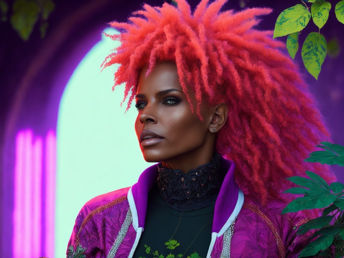 A woman with vibrant orange and pink spiky hair, with shaved sides, is looking to the left of the frame. Her face is turned to the left side in profile. She has subtle pink eyeshadow, eyeliner, and pink lips. She's wearing a purple and pink bomber jacket or activewear