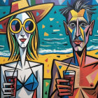 The image features two stylized figures in vibrant colors, one wearing a sun hat and sunglasses, and the other shirtless. They hold drinks against a bright, abstract background reminiscent of summer.
