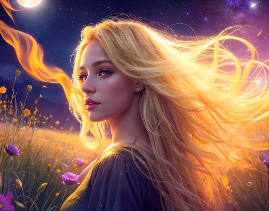 A young woman with golden blonde hair dances in a meadow full of flowers. Fireflies around her.